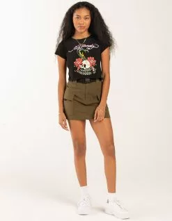 Ed Hardy Rose Cobra Womens Baby Tee. Large graphic on front and back. Ribbed crew neckline. Short sleeves. Baby tee fit . 100% Cotton. Machine wash. Imported.