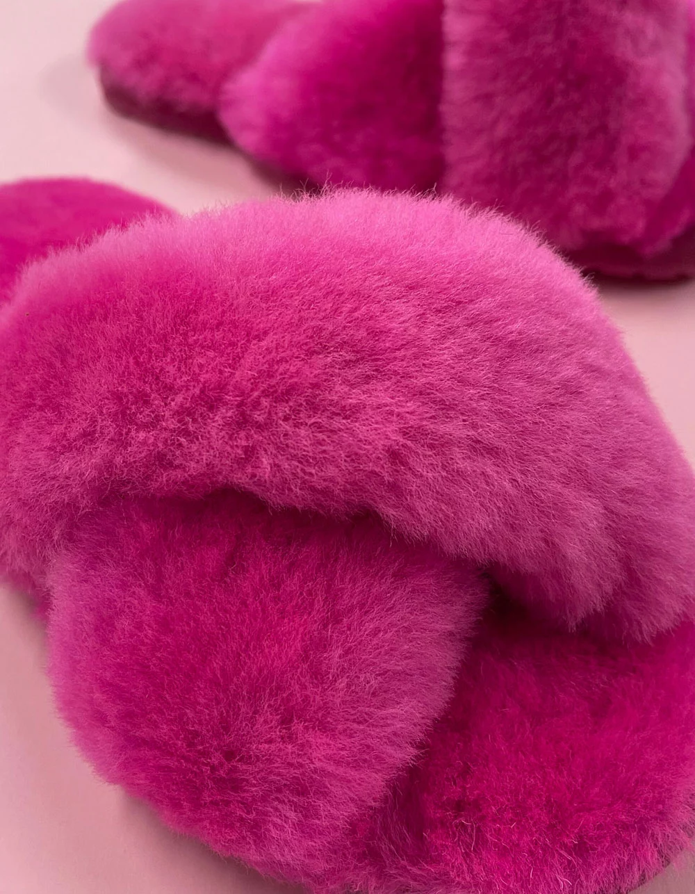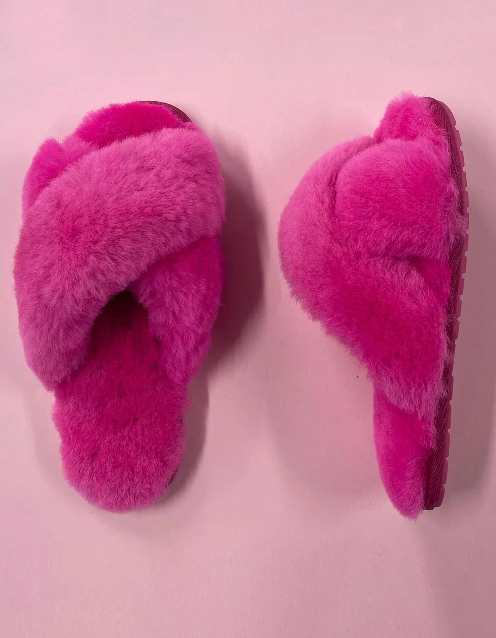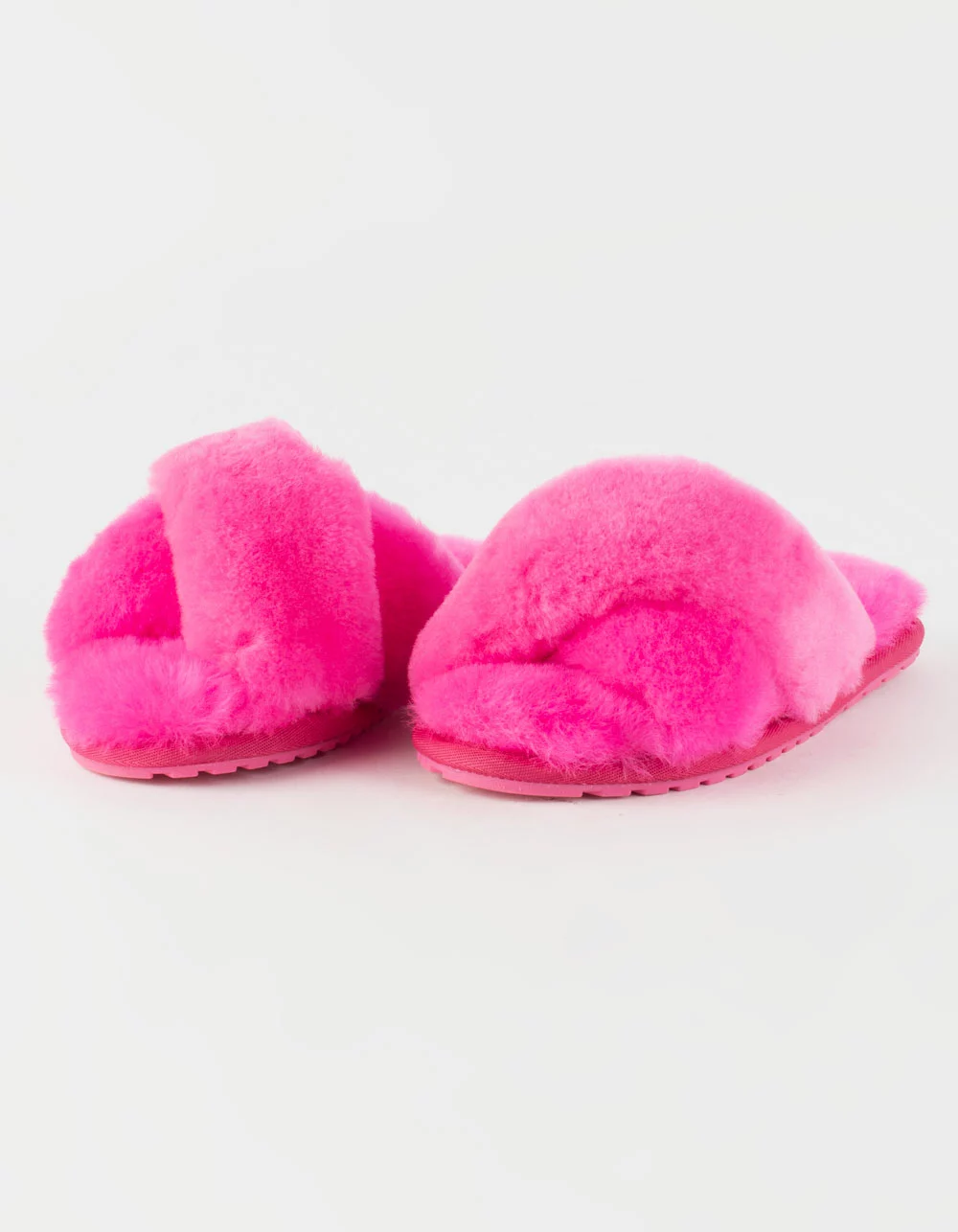 This limited-edition Barbie™ Mayberry slipper features the iconic EMU Australia cross over design featuring the signature Barbie pink for the quintessential Barbie look. In celebration of the Barbie Dreamhouse™️ 60th anniversary, EMU Australia introduces the limited-edition Barbie™️ Mayberry slipper to take your lounge look to the next level. Woolmark accredited Australian sheepskin offers ultimate comfort, while the crossover straps and open-toe design offers easy wear. The flexible rubber outsole features a wave design for traction and grip, suitable for indoors and out. Australian sheepskin features temperature regulating properties, keeping feet warm in the winter and cool in the summer, meaning you can wear these slippers 365 days of the year. The Barbie Mayberry slippers will feel firm at first. Over time, they will naturally give and mold to your feet for the perfect fit. Limited edition Barbie™️ x EMU Australia Mayberry slipper. Fluffy, cozy and stylish slipper. 100% Australian sheepskin upper. 100% Australian sheepskin footbed for ultimate comfort. Iconic crossover design detail. Sheepskin breathes, and naturally ‘wicks away moisture’ leaving footwear odorless, and your feet perfectly warm in winter and cool summer. Lightweight, flexible TPR outsole with wave design for traction and support. Snug fit. Woolmark Accredited.