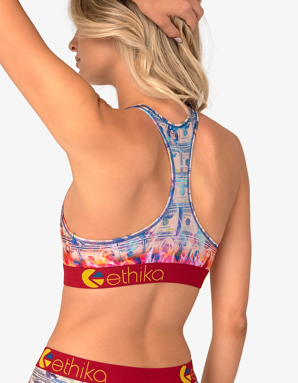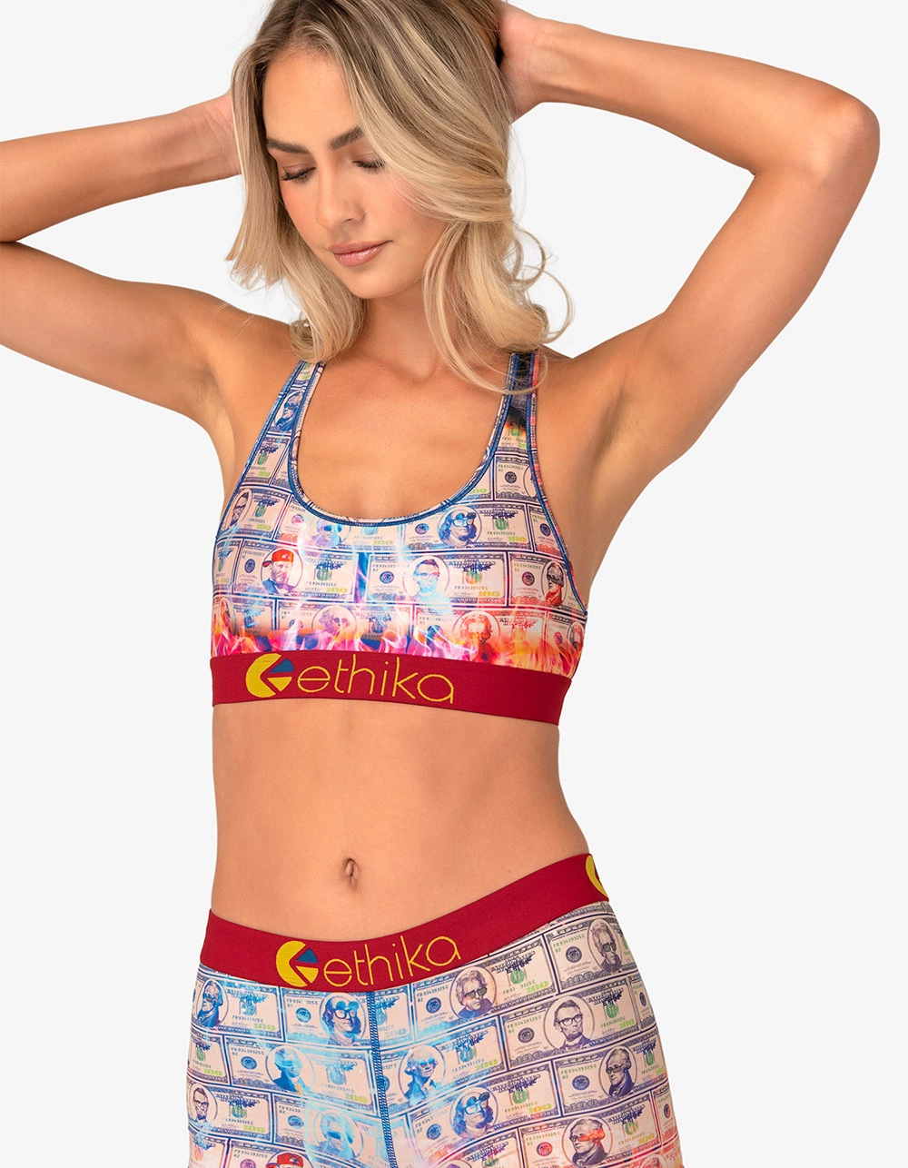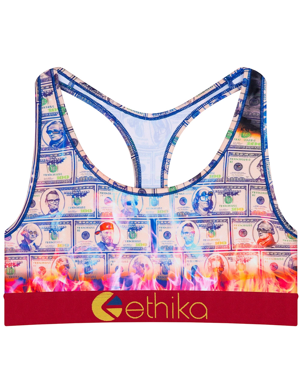 Ethika Benji Burner Sports Bra. Soft modal fabric. Double layered front panel. Racer back straps. High profile 1 3/8″ Ethika logo band. Tonal topstitching. 90% Polyester 10% Spandex. Top and bottom sold separately. Machine wash. Imported.