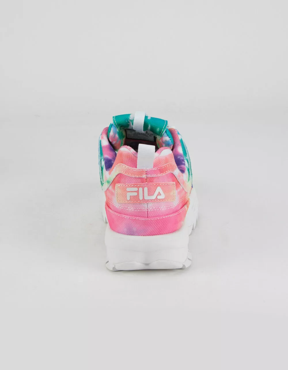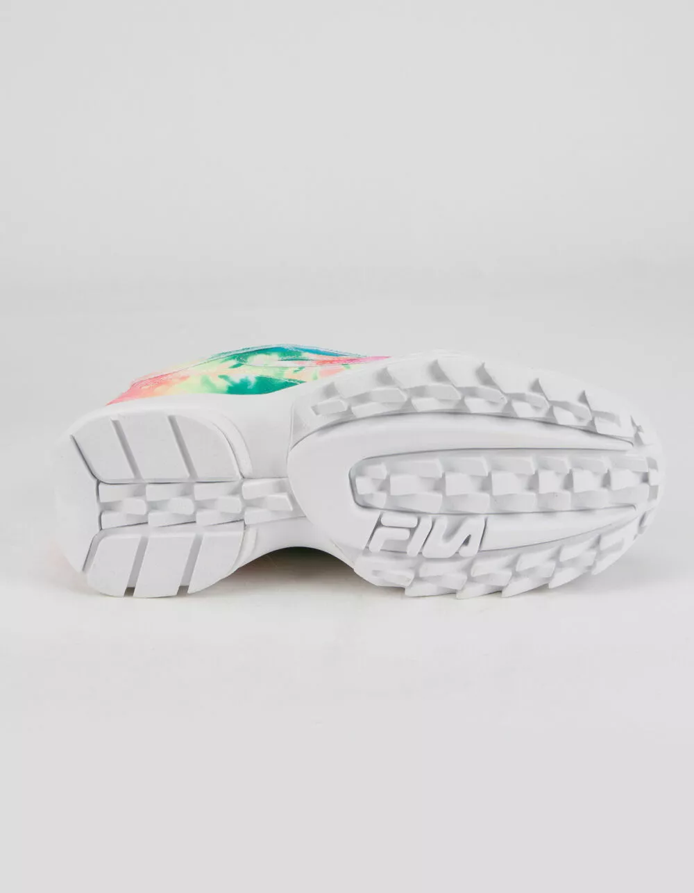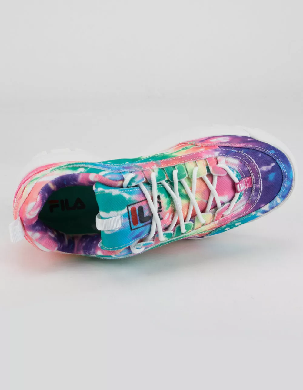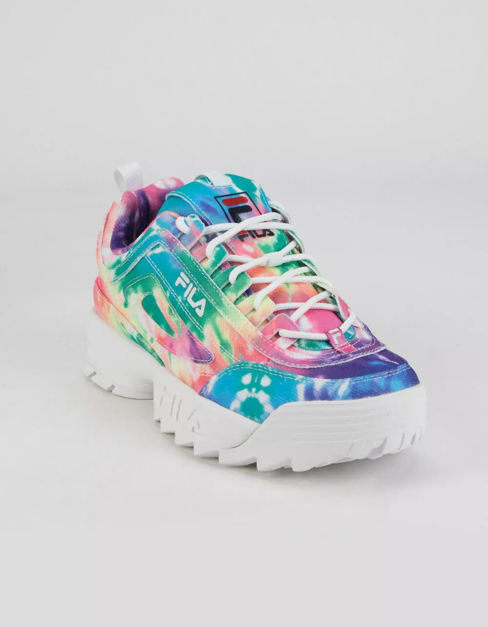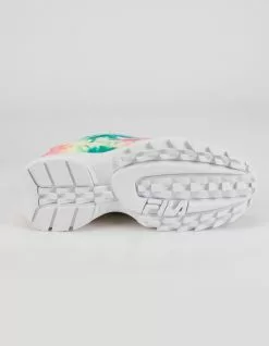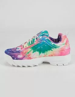 Fila Disruptor II Premium shoes. The chunky ‘90s design of the Disruptor gets a color update for the modern age. Premium leather with a bright tie dye print. Lightweight EVA. Molded rubber outsole. Embossed and embroidered color logos. Unique eyebrow detailing. Approx. platform height: 1.5″. Lace up closure. Imported.