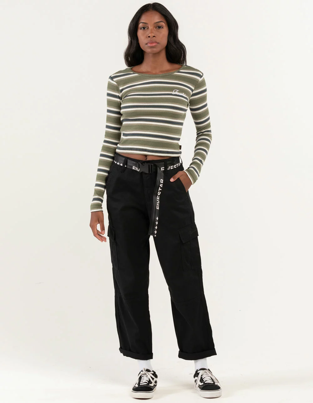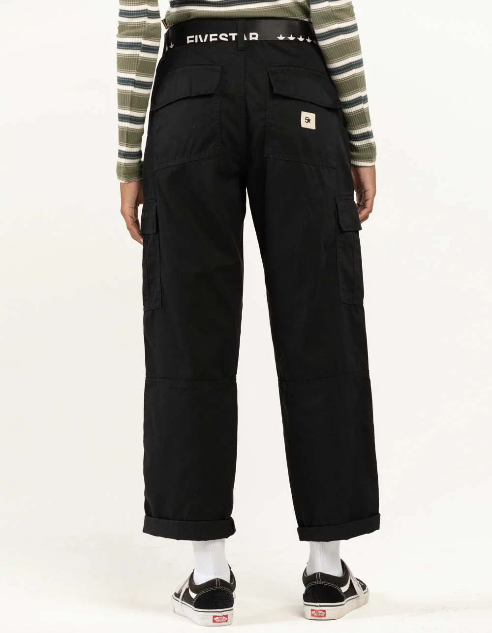 Fivestar General Co. Belted Utility Cargo Pants. Branded belt attached. Button front and zip fly. Cargo pockets. Slant hand pockets. Back patch pockets. Hook and loop closures. Approx inseam: 28.5″. 100% Cotton. Machine wash. Imported.