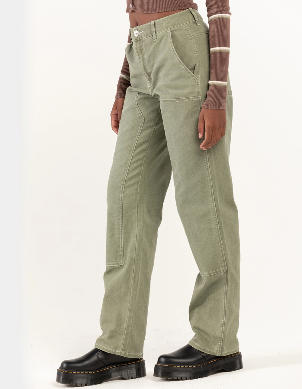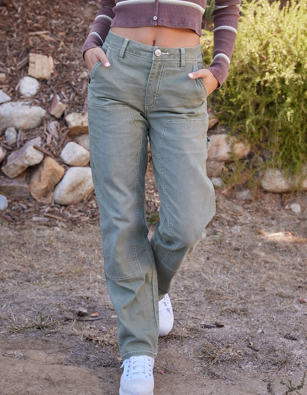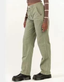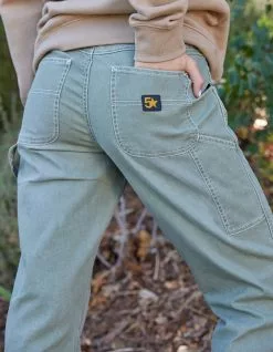 Fivestar General Co. Carpenter Pants. Button front with zipper fly. Double knee. Contrast stitching. Slant hand pockets. Back patch pockets. Carpenter loop at mid left leg. Straight leg fit. Approx. inseam: 31′. 98% Cotton 2% Spandex. Machine wash. Imported.
