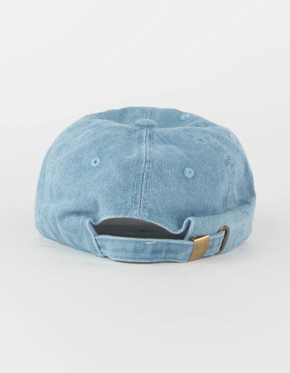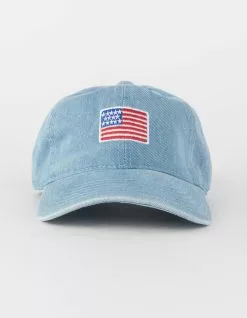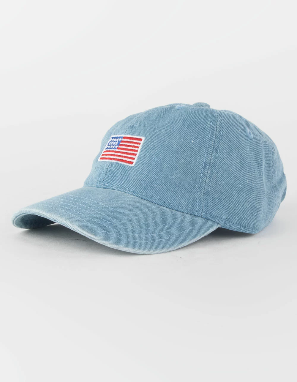 Flag Denim Dad Strapback Cap. Embroidered American flag on front. Adjustable strapback. Curved visor. 100% Cotton. Machine wash. Imported.