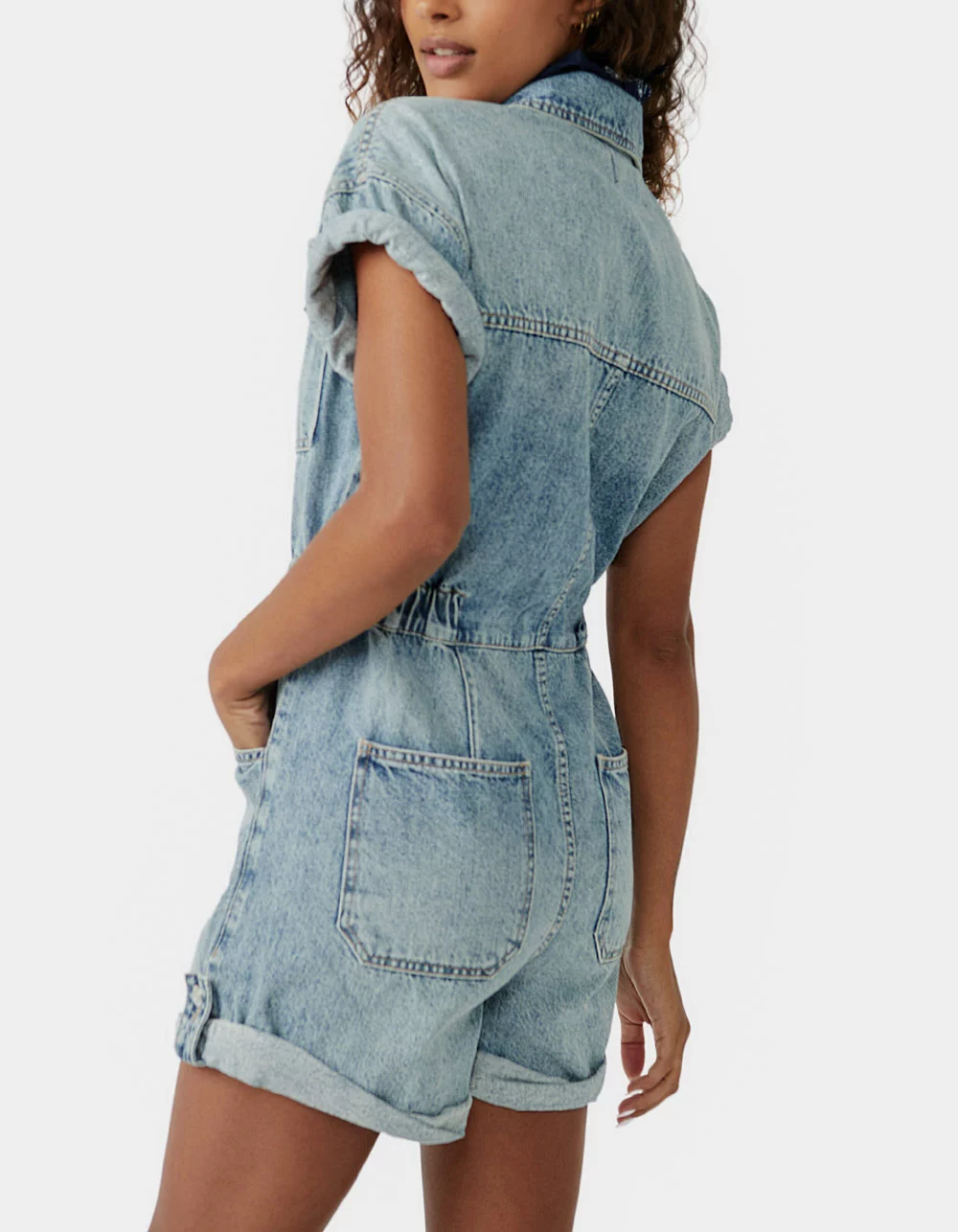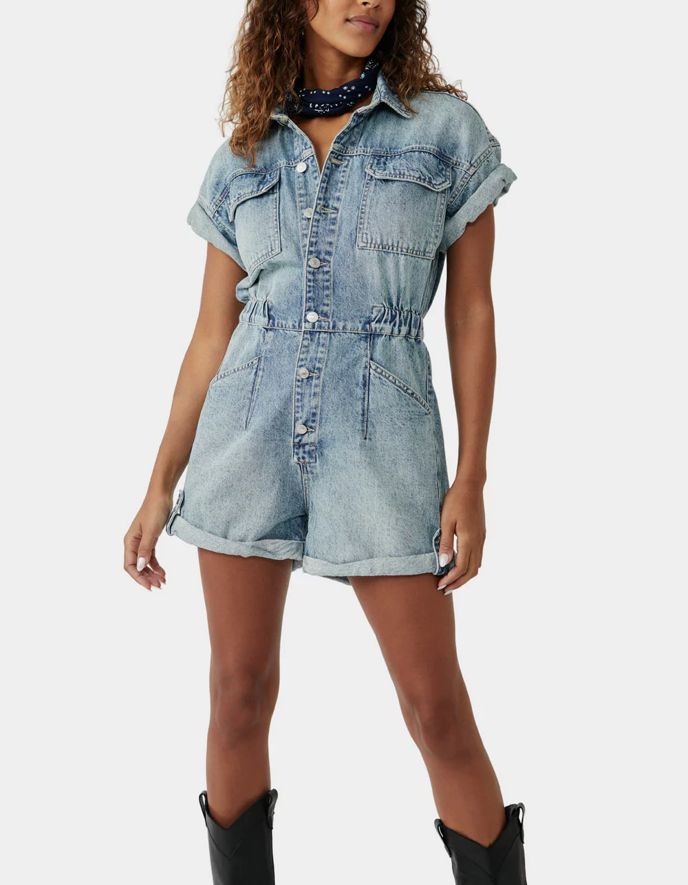Free People Marci Shortall. Relaxed, button-up silhouette. Front button closures, classic collar detail, cuffed hemlines and armholes, workwear pockets throughout, rigid denim fabrication. A true done-in-one, pair this with sporty sneakers or toughened up boots for endless ways to wear. 3.25” inseam. 100% Cotton. Machine wash. Imported.