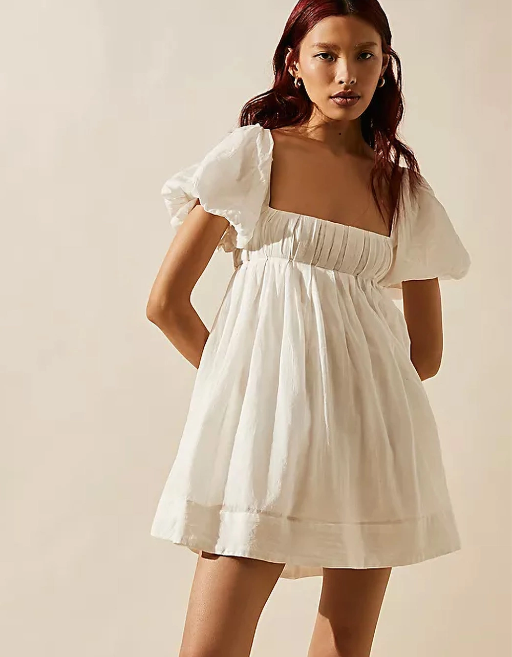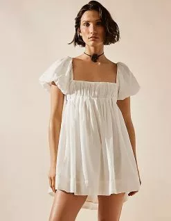 Free People Marina Mini Dress. Featuring puff sleeves and pleated detailing at the bust in a billowy, effortless design. Square neckline. Adjustable strap and cinch tie-back detailing. Lined. 100% Cotton. 100% Modal Lining. Machine wash. Imported.