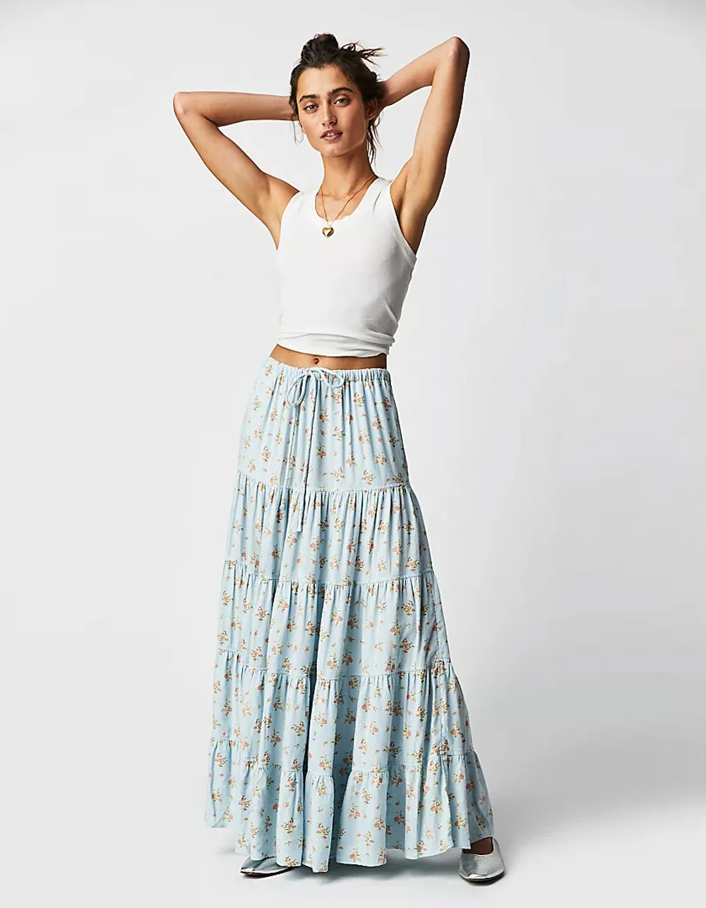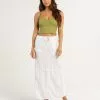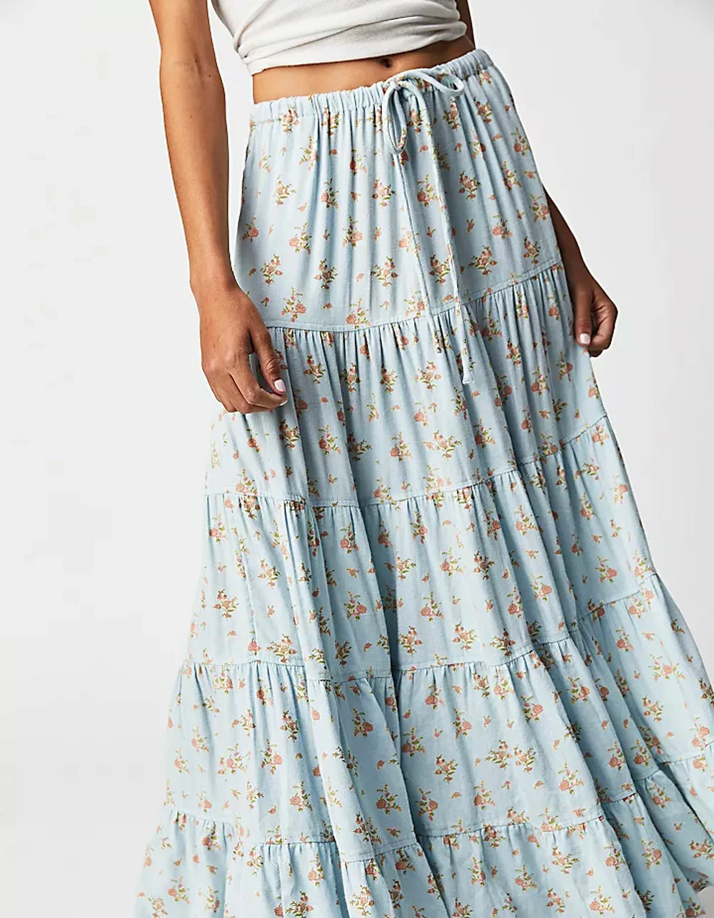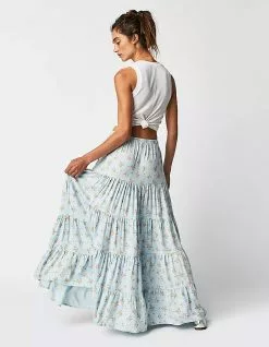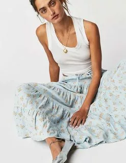 Free People Nova Tiered Maxi Skirt. Perfectly printed and just as timeless, this stunning maxi skirt will turn heads with every wear. Low-rise, billowy A-line silhouette. Pull-on design. Drawstring waistband. Vintage-inspired floral print. Tiered seaming throughout. Side pockets. 76% Viscose 24% Linen. Machine wash. Imported.