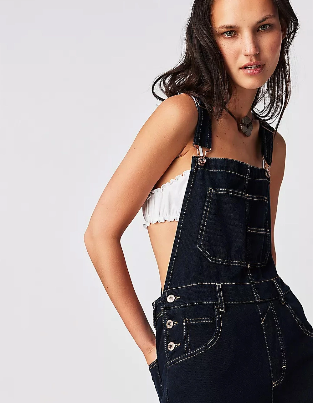 Free People Ziggy Overalls. Bib-and-brace design. Tapered legs. Exaggerated bib pocket detail. Rigid denim fabrication. Varied distressing throughout. Relaxed, slouchy silhouette. 100% Cotton. Machine wash. Imported.