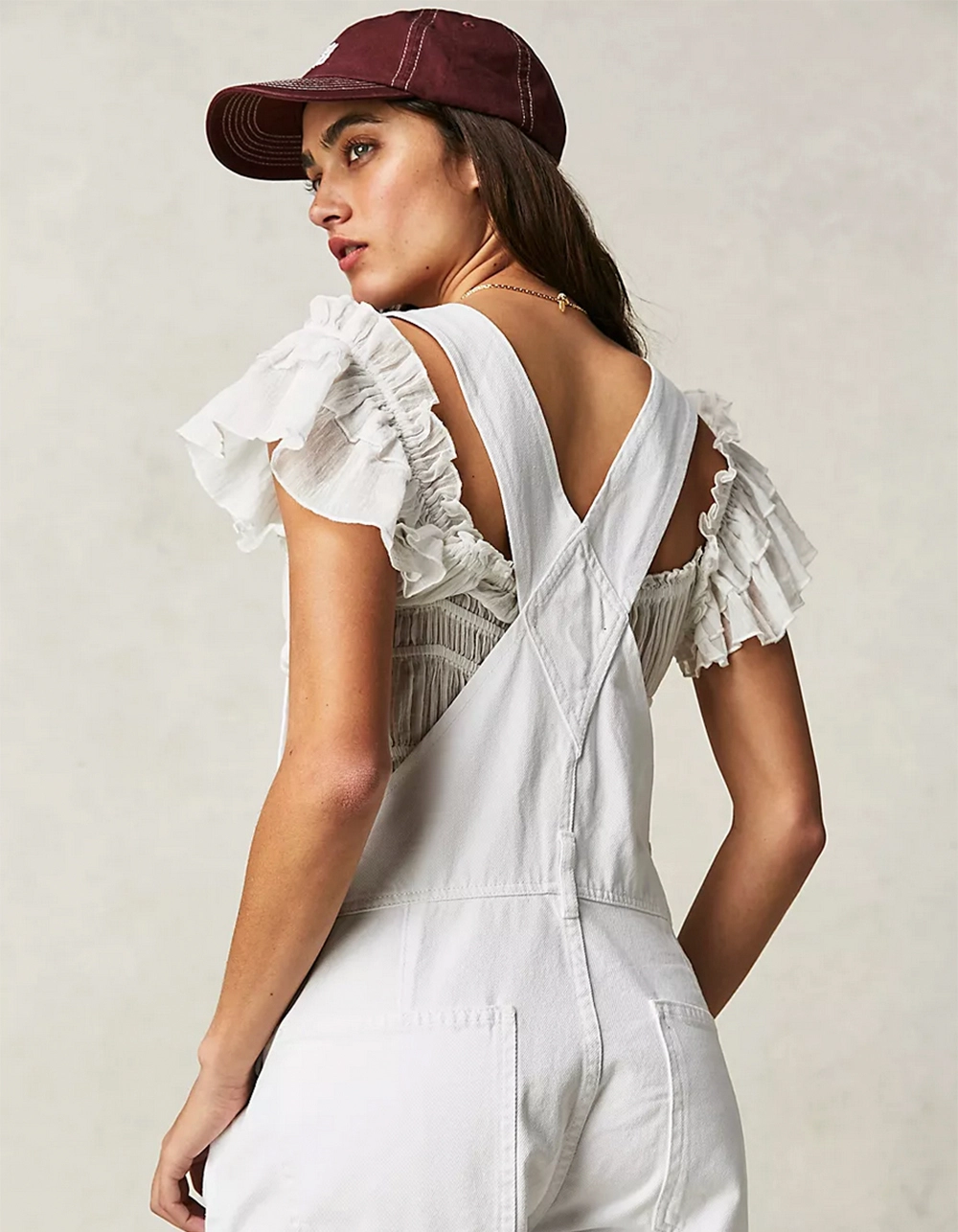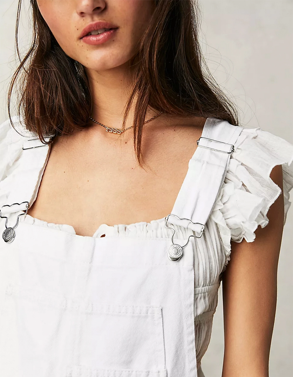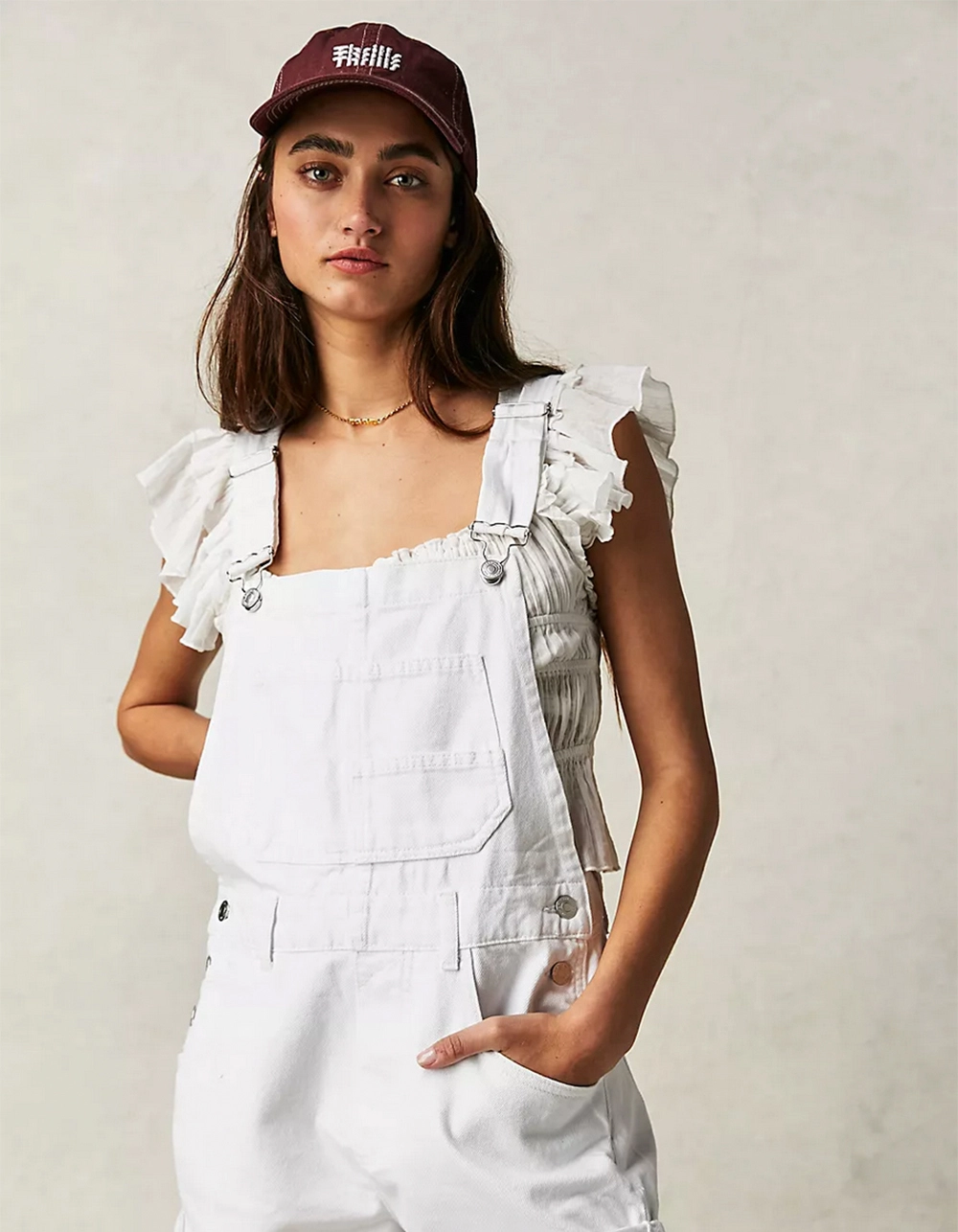 Free People Ziggy Shortalls. Relaxed bib-and-brace silhouette. Features front bib pocket, rolled hemlines, adjustable straps, side button closures, five-pocket design, frayed cuffs. Perfect for warmer weather or fun outdoor adventures. 100% Cotton. Machine wash. Imported.