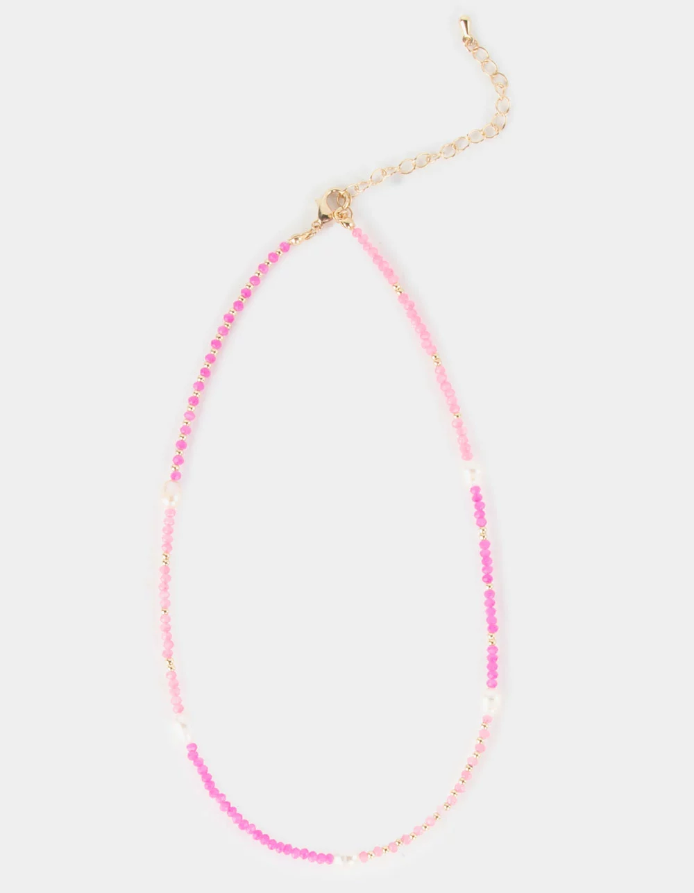 Fresh Water Pearl Seed Bead Choker Necklace. Pink and gold seed beaded necklace, featuring fresh water pearls. Lobster clasp closure. Imported.