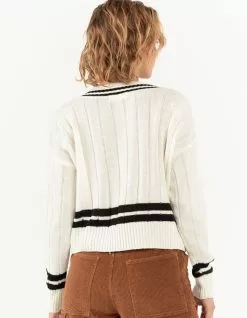 Full Circle Trends Cable Knit V Neck Varsity Sweater. V Neck. Cable knit. Long sleeves. Varsity stripes. Crop hem. 100% Acrylic. Machine wash. Imported.