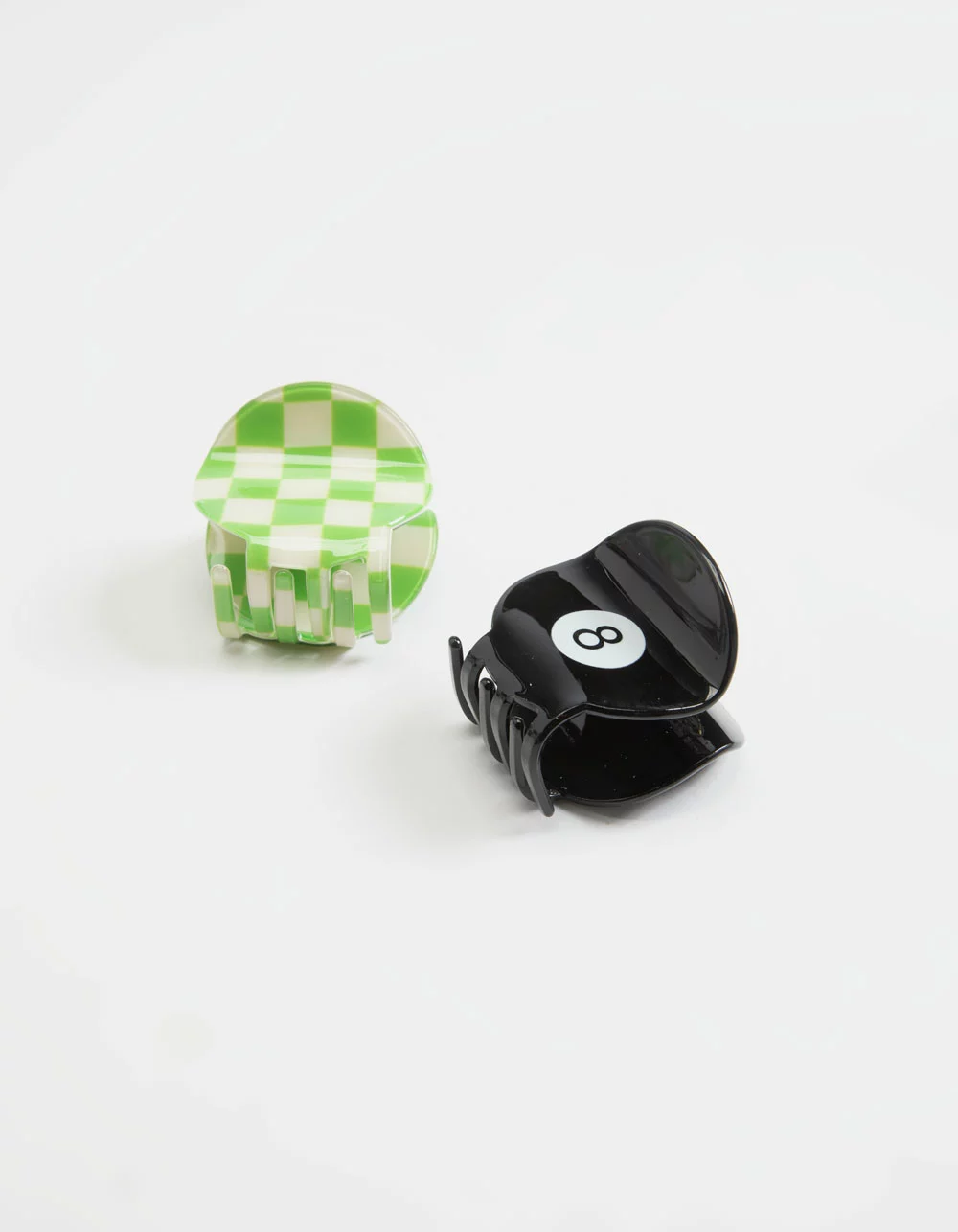 Full Tilt 2 Pack Eight Ball Check Claw Hair Clips. Plastic hair clips. Checker print. Eight ball print. Imported.