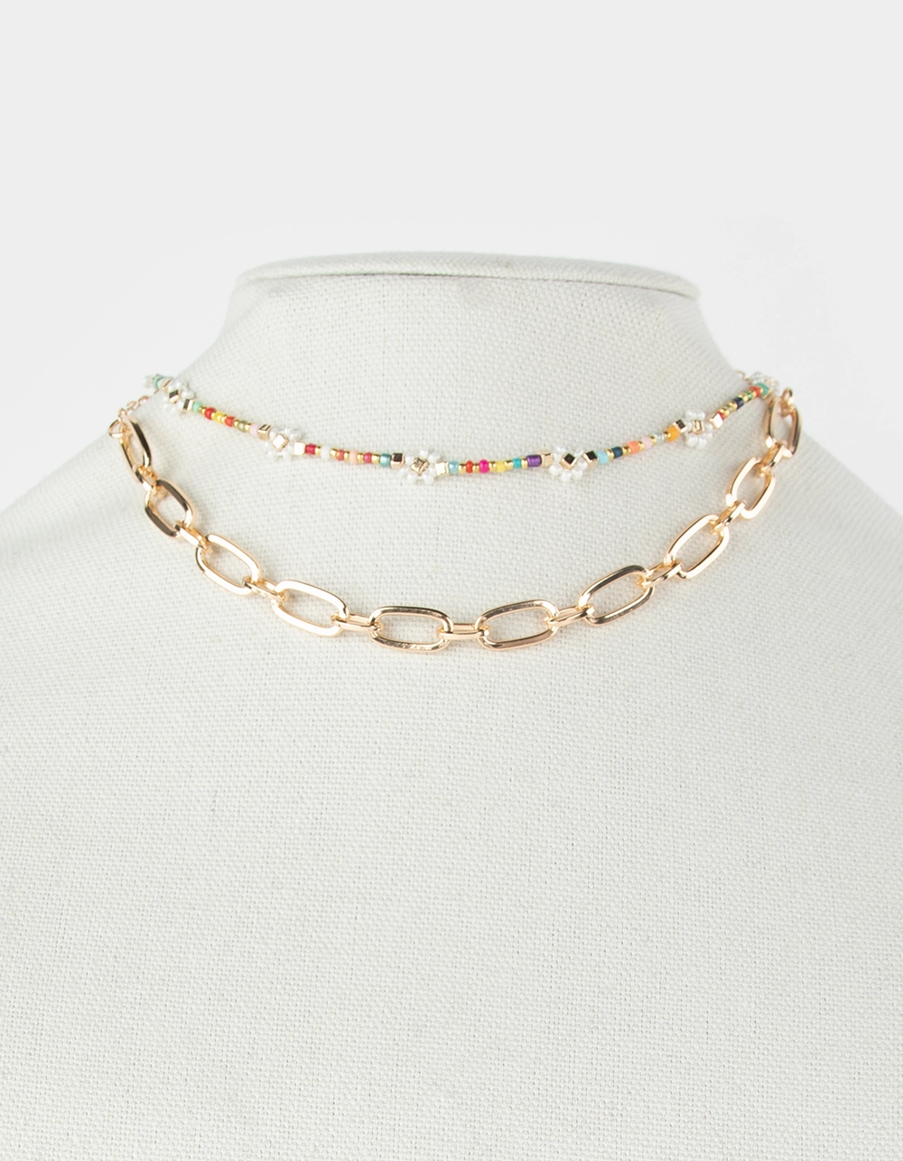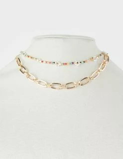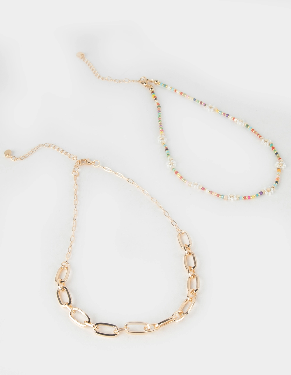 Full Tilt 2 Piece Beaded Floral Necklace. Two necklaces that can be worn together as a set or individually. One chain link necklace. One vibrant beaded necklace featuring beaded flowers. Lobster clasp closures. Gold tones. Imported.