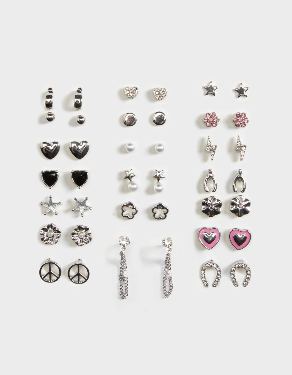 Full Tilt 20 Pack Rhinestone Lucky Earring Set. Various shapes & charms. Post back closures. Imported. California Residents: WARNING PROP 65: This product can expose you to chemicals including lead, which is known to the State of California to cause cancer and birth defects or other reproductive harm. For more information go to www.P65Warnings.ca.gov.