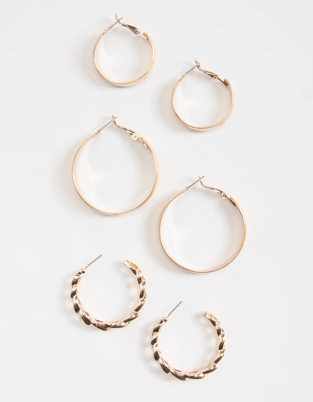 Full Tilt 3 On Chain Chunky Hoop Earrings. 3 piece set. Multiple sizes and designs. Gold toned. Latch back and pin closure. Imported.