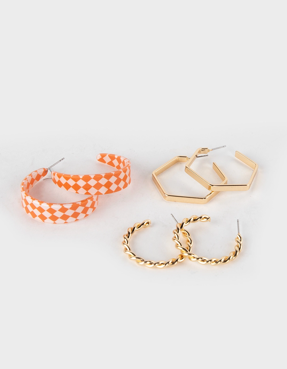 Full Tilt 3 Pack Checkered Hoop Earrings. Various styled hoops. Gold toned earrings. Post back closures. Imported. WARNING PROP 65: This product can expose you to chemicals including lead, which is known to the State of California to cause cancer and birth defects or other reproductive harm. For more information go to www.P65Warnings.ca.gov.