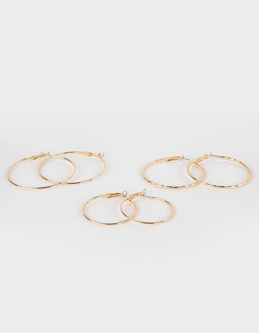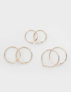 Full Tilt 3 Pack Dainty Hoop Earring Set. Various hoops that differ in size and texture. Post back closures. Gold toned. Imported. . California Residents: WARNING PROP 65: This product can expose you to chemicals including lead, which is known to the State of California to cause cancer and birth defects or other reproductive harm. For more information go to www.P65Warnings.ca.gov.