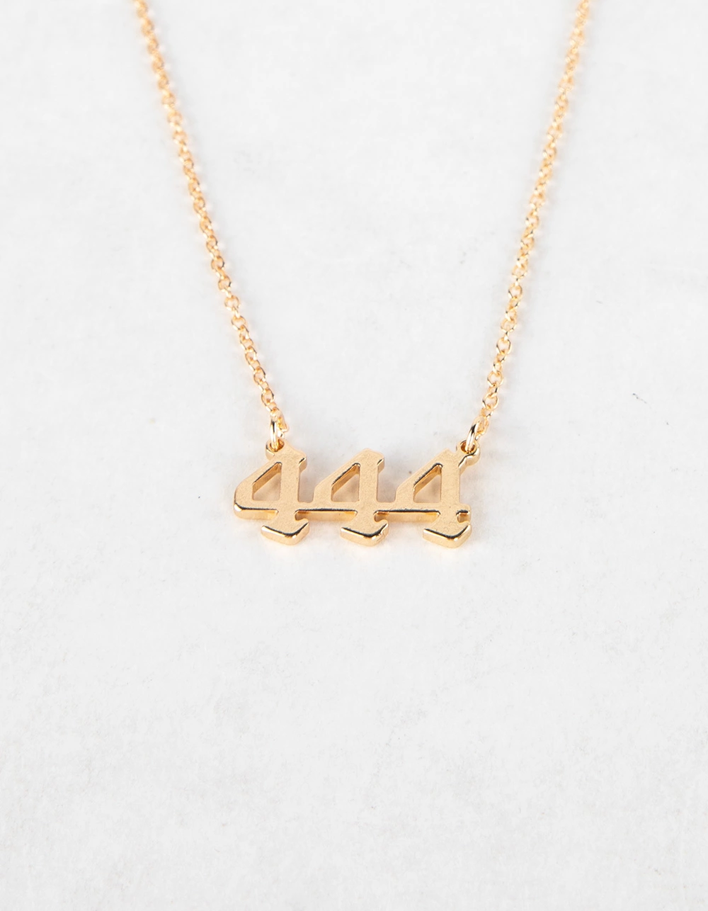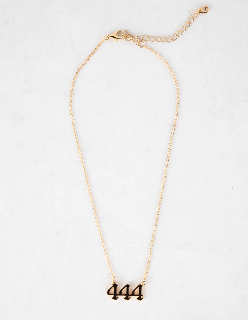 Full Tilt 444 Angel Number Necklace. A necklace with a 444 pendant is the ultimate symbol of stability and support. With its simple yet powerful design, this necklace is perfect for anyone who wants to feel grounded and secure. Dainty chain with lobster clasp closure. Gold tone. Imported.