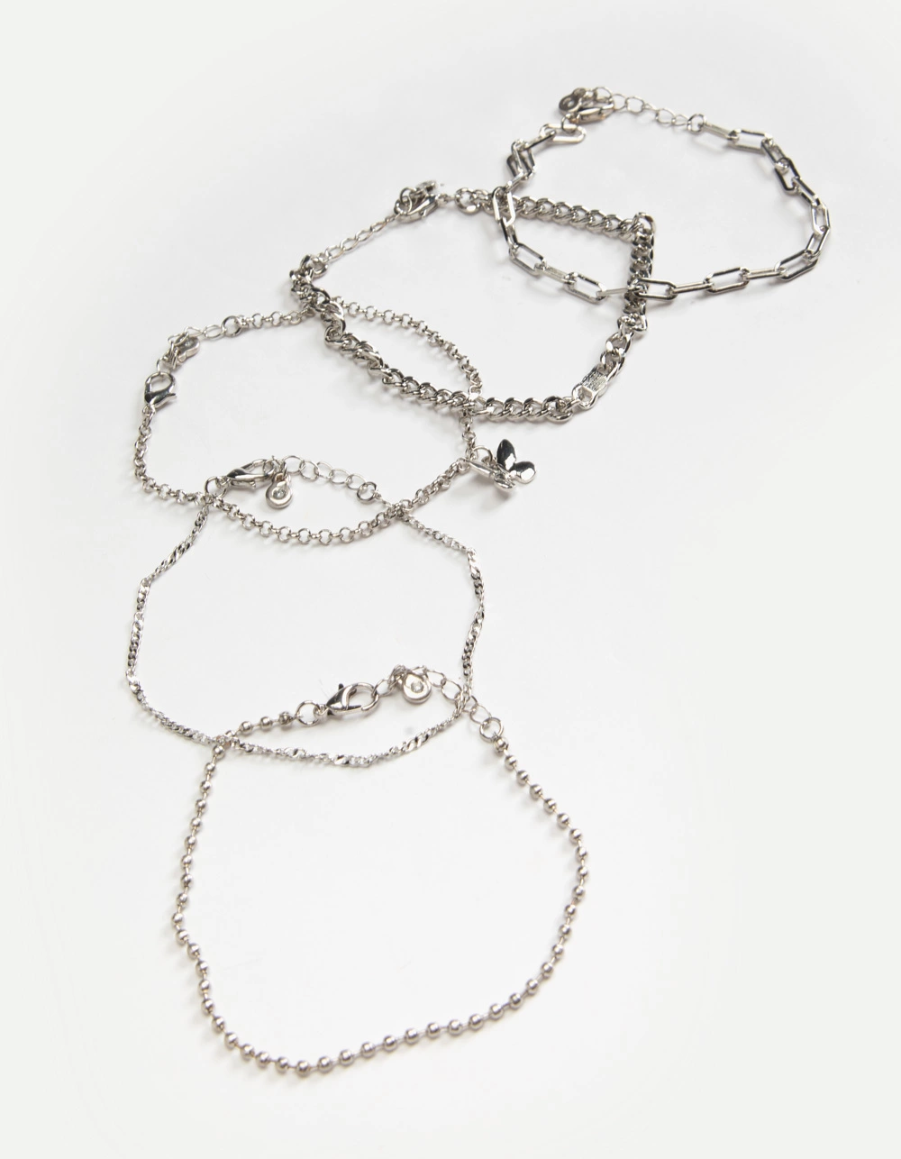 Full Tilt 5 Pack Chain Butterfly Bracelets. Silver tone chain bracelets. Safety pin and butterfly charms. Lobster clasp closures. Set of 5 bracelets. Imported.