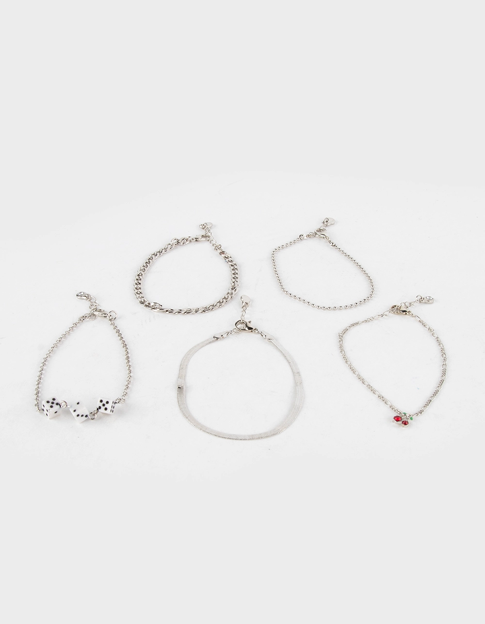 Full Tilt 5 Pack Dice & Ball Chain Bracelet Set. Five bracelets that can be worn as a set or individually. Chain link bracelets, ball chain bracelet and herringbone bracelet. Features Dice and cherry charms. Silver tones. Lobster clasp closures. Imported. WARNING PROP 65: This product can expose you to chemicals including lead, which is known to the State of California to cause cancer and birth defects or other reproductive harm. For more information go to www.P65Warnings.ca.gov.