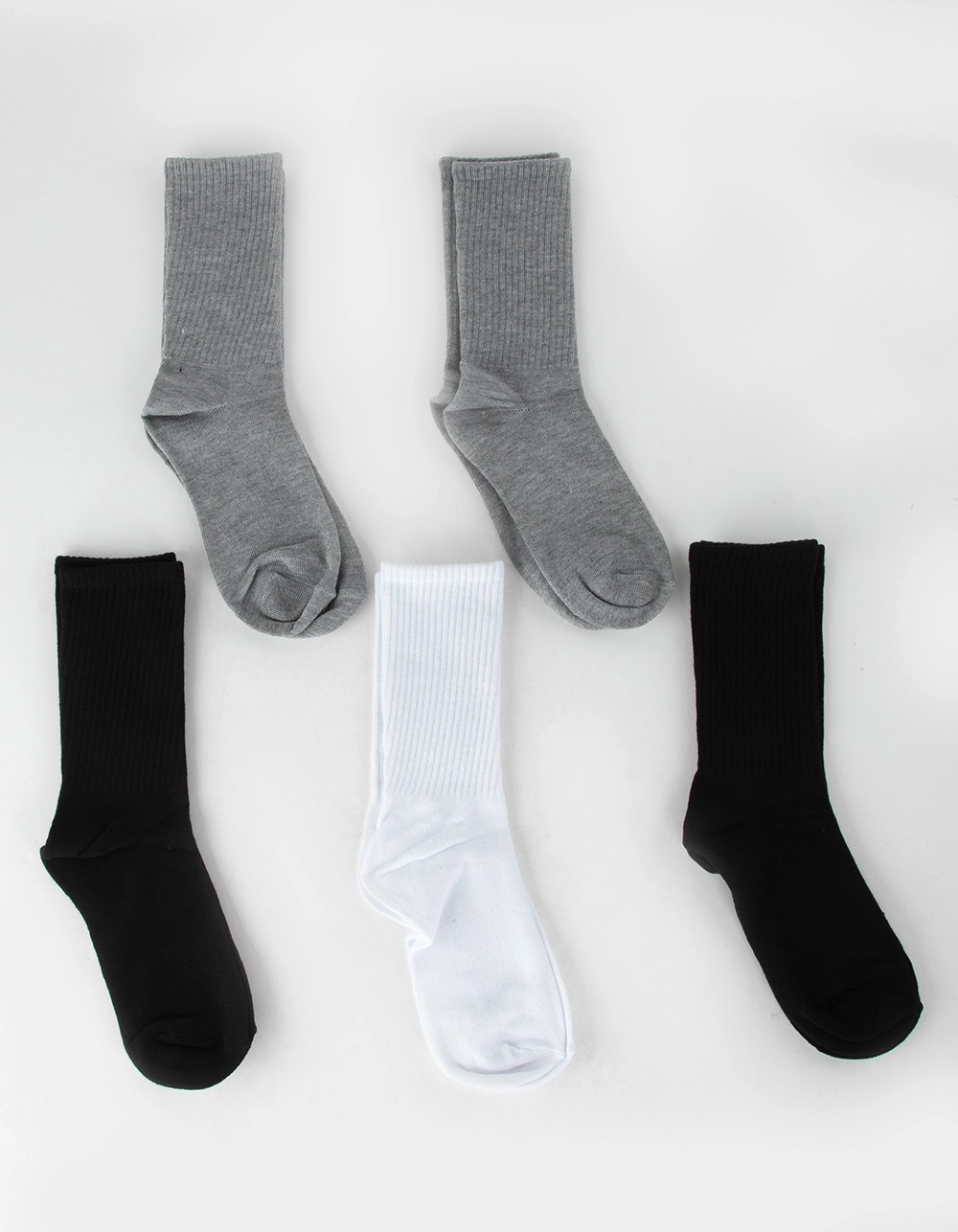 Full Tilt 5 Pack Crew Socks. Ribbed upper crew socks. Elastic cuff. Sock height that reaches the lower calf. 97% Polyester, 3% Spandex. Machine wash. Imported.
