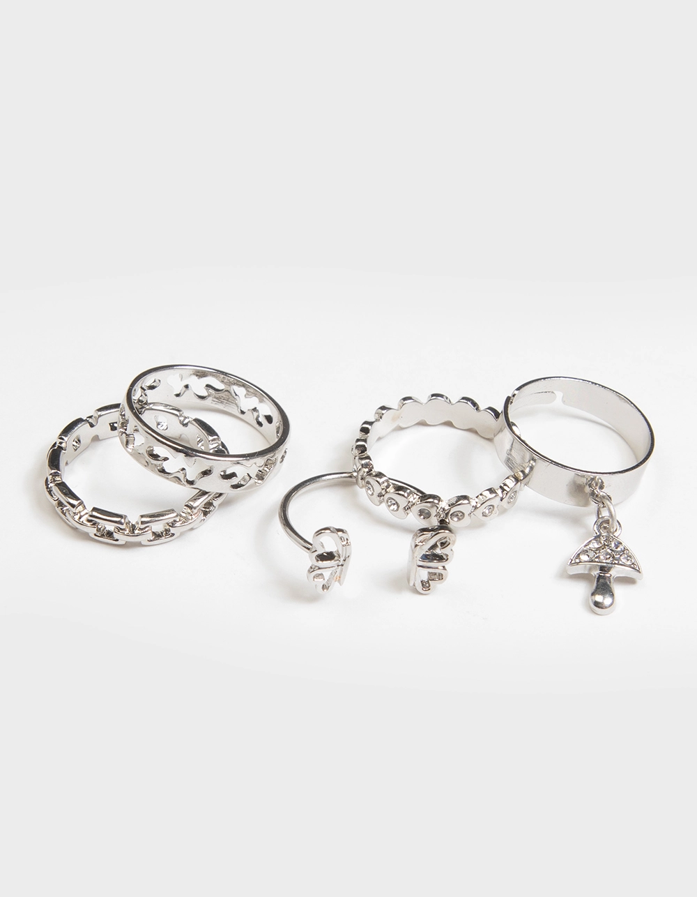 Full Tilt 5 Piece Butterfly & Flame Ring Set. Various shapes & designs. Silver tone. Imported. California Residents: https://www.p65warnings.ca.gov/sites/default/files/ws/bw6pt.png WARNING PROP 65: This product can expose you to chemicals including lead, which is known to the State of California to cause cancer and birth defects or other reproductive harm. For more information go to www.P65Warnings.ca.gov.
