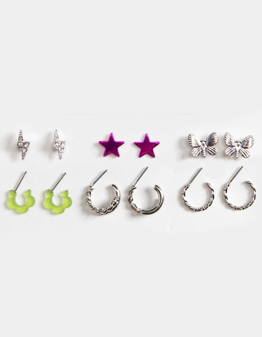 Full Tilt 6 Piece Star Flower & Twisted Earring Set. Silver toned earrings. 6 Piece set. Various charms. Imported.