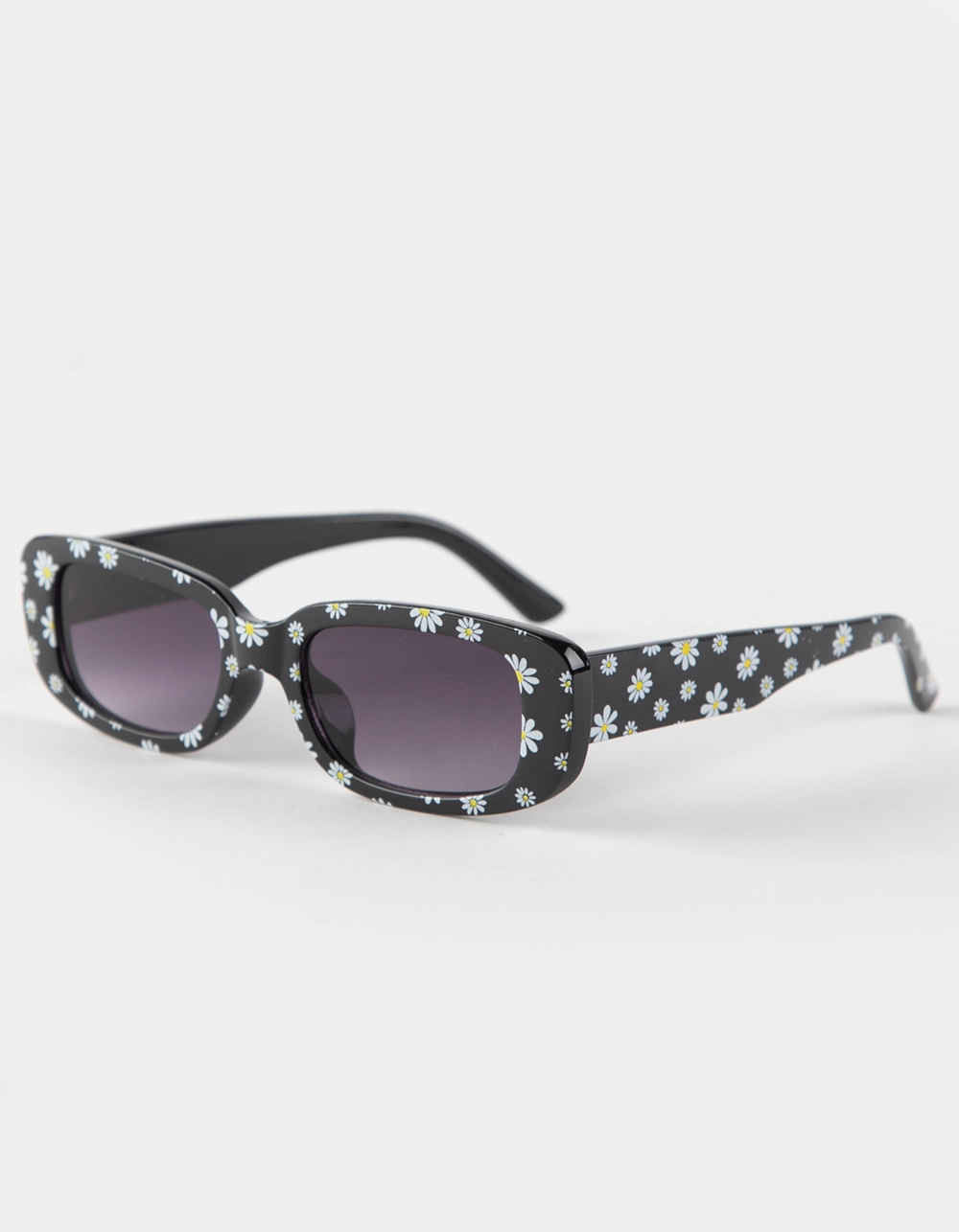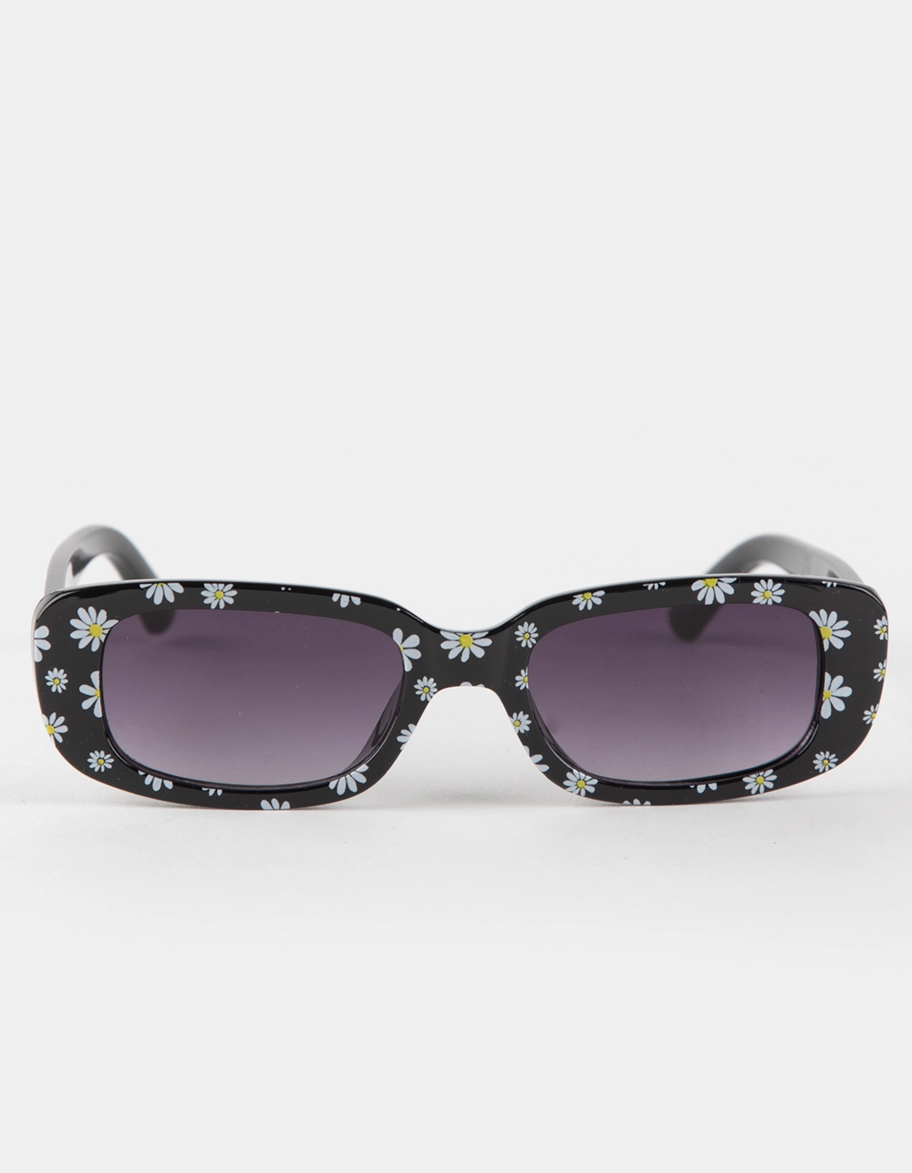 Blue Crown Printed Daisy Rectangle Sunglasses. Dark rectangle lenses. Plastic rectangle frames with nose guards and plastic arms. Imported. California Residents: WARNING PROP 65: This product can expose you to Bisphenol A (“BPA”), a chemical known to the State of California to cause cancer, birth defects and other reproductive harm. For more information go towww.P65Warnings.ca.gov.