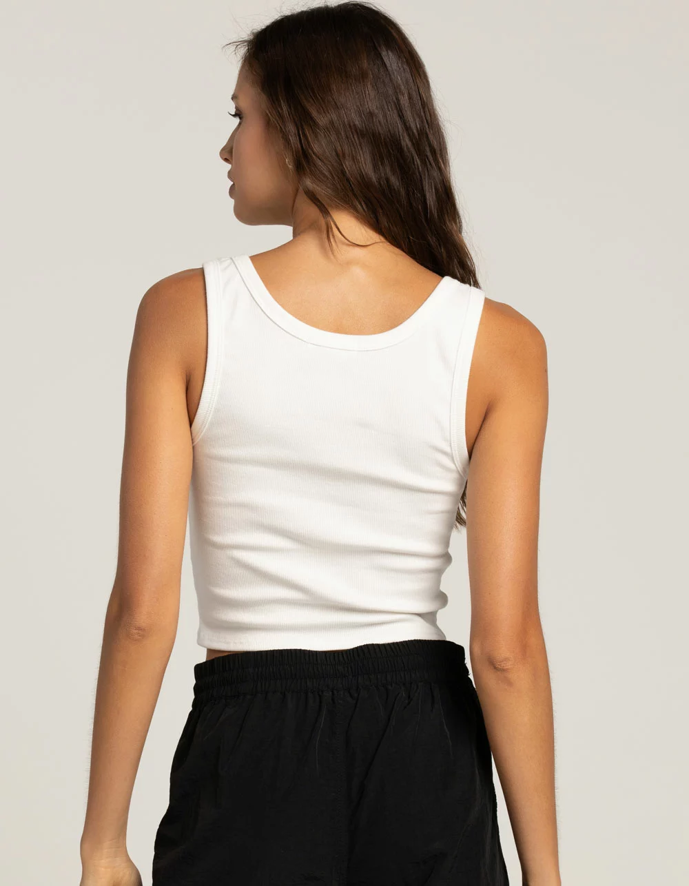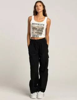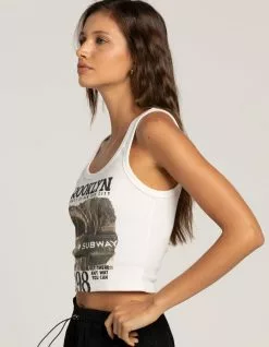 Full Tilt Brooklyn Tank Top. Rib knit construction. Large graphic on front. Scoop neckline. Sleeveless. Cropped fit. 48% Cotton, 47% Polyester, 5% Spandex. Machine wash. Imported.