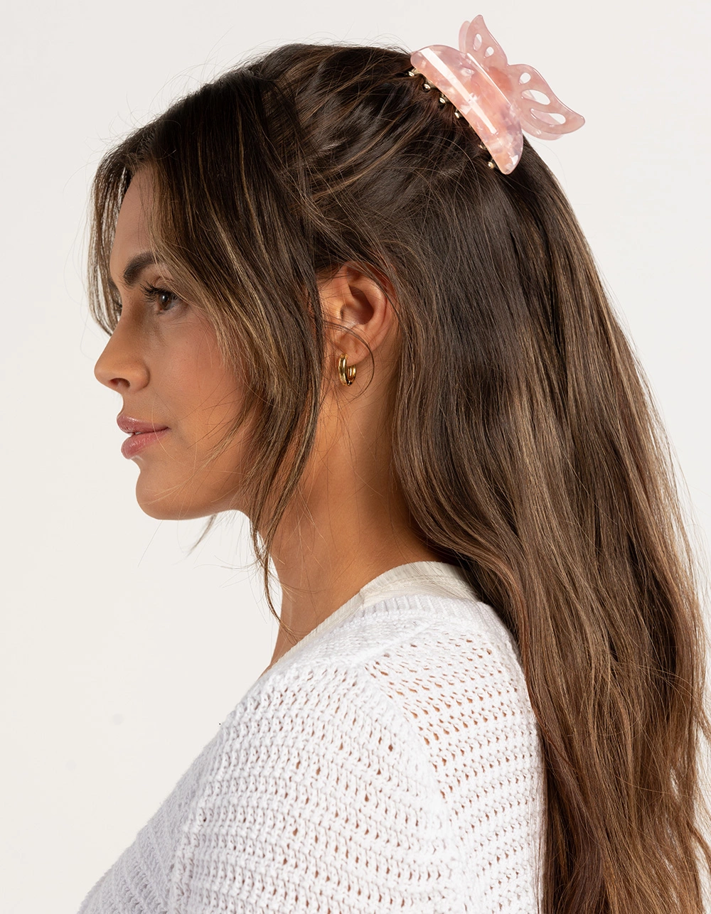 Full Tilt Butterfly Claw Clip. Butterfly shaped claw hair clip. Gold toned. Plastic. Imported.