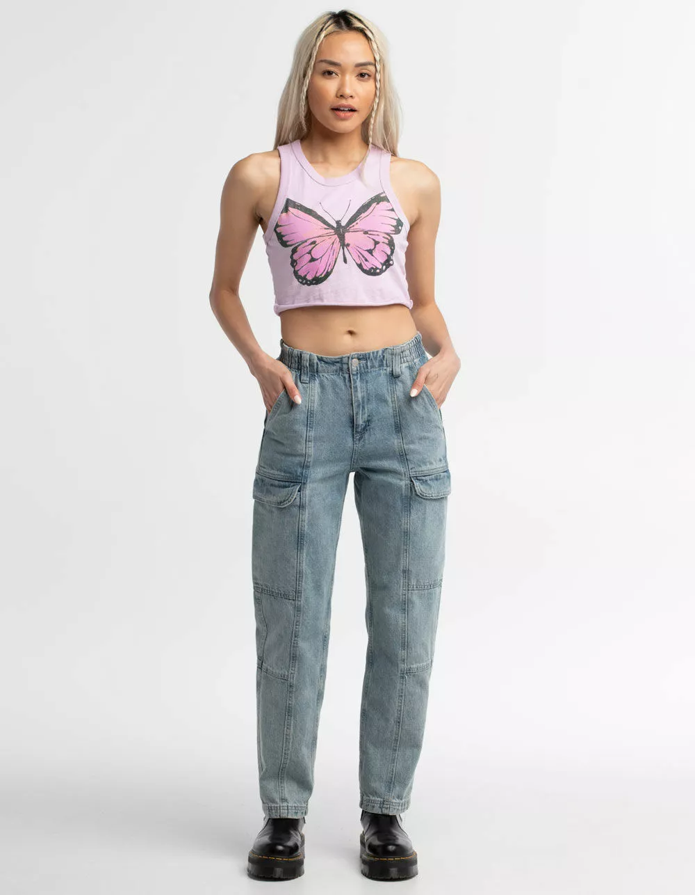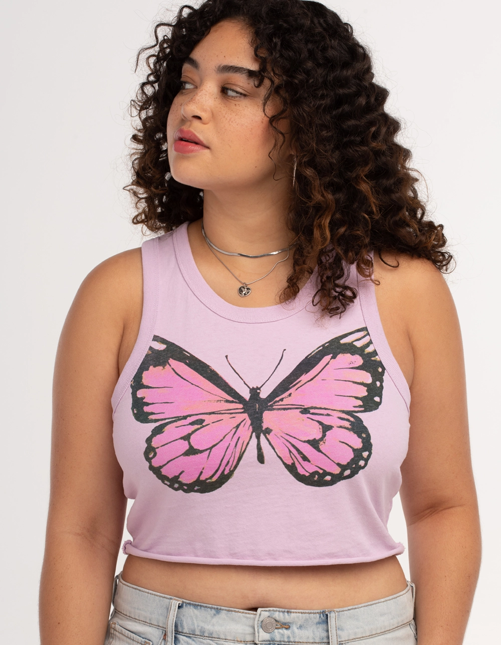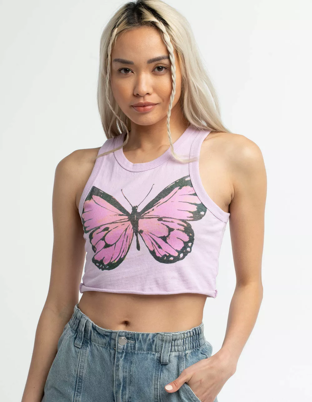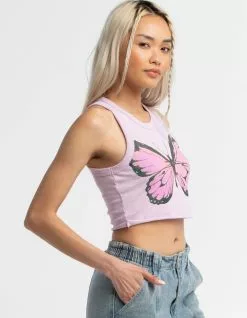 Full Tilt Butterfly Crop Tank Top. Graphic on front. Scooped neckline. Sleeveless. 100% Cotton. Machine or hand wash. Imported