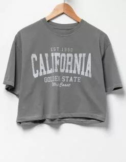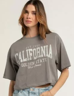 Full Tilt California Crop Tee. Large graphic screened across front. Ribbed crew neckline. Short sleeve. Cropped fit. Contrast stitching. 100% Cotton. Machine wash. Imported.