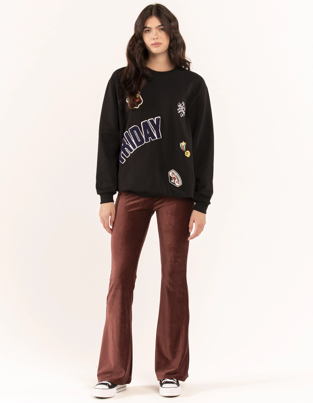 Full Tilt Friday Patch Crewneck Sweatshirt. Allover patches. Cuffed long sleeves and hem. Ribbed crew neckline. Long sleeves. 60% Cotton 40% Polyester. Machine wash. Imported.