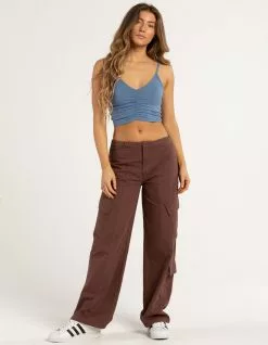 Full Tilt Front Cinch Cami. V-neckline. Rib knit construction. Cinch detailing down center front. Fixed spaghetti straps. Fitted silhouette. Cropped. 93% Rayon, 7% Spandex. Hand wash. Imported.