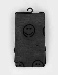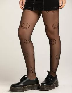 Full Tilt Tights. Happy face pattern. Sheer. One size fits most: 5’0″-5’10” 100-175 lbs.. 86% Nylon 12% Spandex 2% Cotton. Imported.