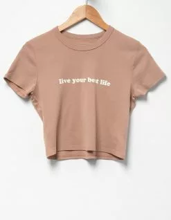 Full Tilt Live Your Best Life Baby Tee. Graphic screened on center chest. Ribbed crew neckline. Short sleeve. Cropped fit. 100% Cotton. Machine wash. Imported.