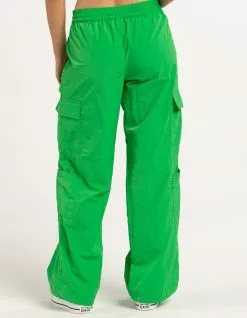 Full Tilt Low Rise Nylon Parachute Cargo Pants. Crinkle nylon fabric. Elastic waistband with adjustable toggle for a custom fit. Slant hand pockets and cargo pockets with snap closures. Baggy fit, straight leg. Adjustable toggles at pant hem. Approx. inseam: 30.5”. 100% Nylon. Hand wash. Imported.
