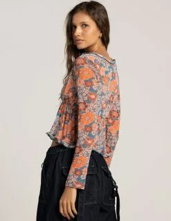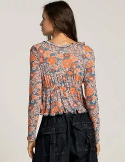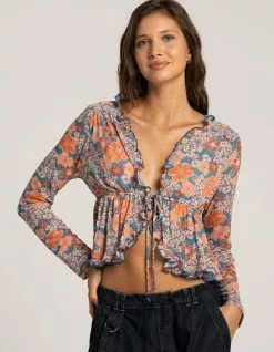 Full Tilt Mesh Flyaway Top. Allover mesh floral print. Partial open front with tie closure at waist. Ruffle trim. Long sleeve. 96% Polyester, 4% Spandex. Machine wash. Imported.