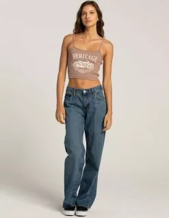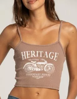 Full Tilt Moto Cami Top. Ribbed knit construction. Large graphic screened on front. Adjustable spaghetti straps. Fitted silhouette. Cropped fit. 100% Cotton. Machine wash. Imported.
