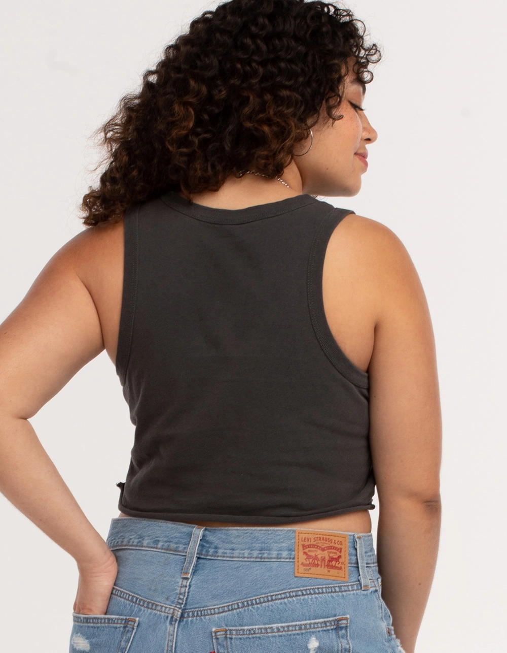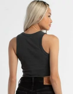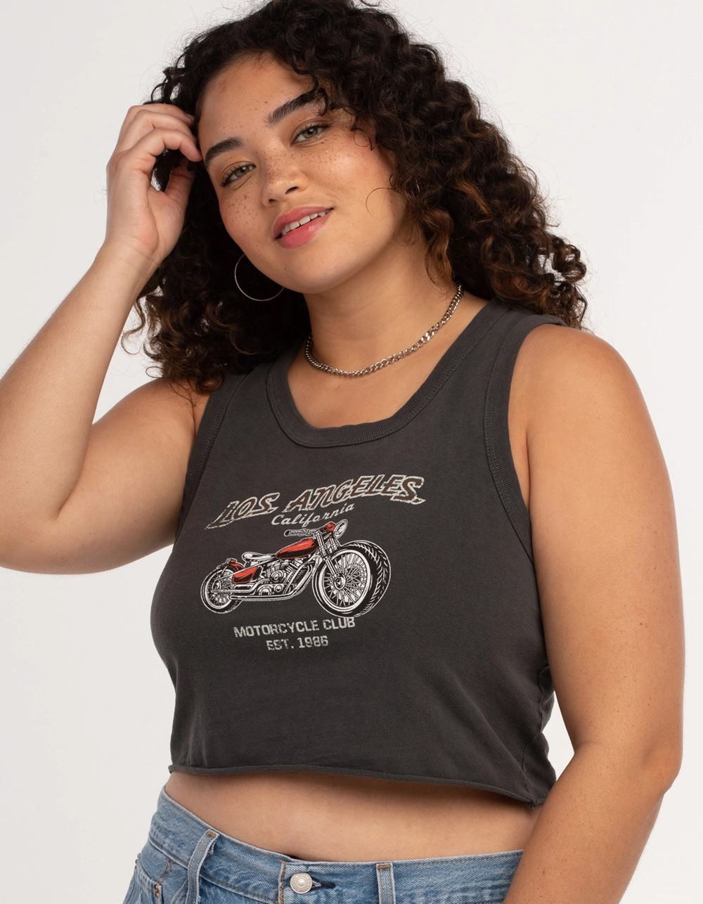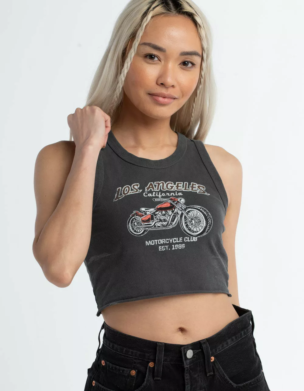 Full Tilt Motorcycle Crop Tank Top. Graphic on front. Scooped neckline. Sleeveless. 100% Cotton. Machine or hand wash. Imported