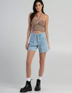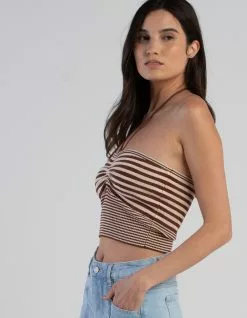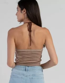 Full Tilt Multi Strip Halter Top. All over stripe pattern. Halter ties. Cinch front. Allover ribbed stretch fabrication. Fitted silhouette. 70% Viscose 30% Nylon. Machine wash. Imported.
