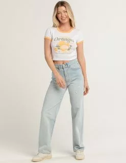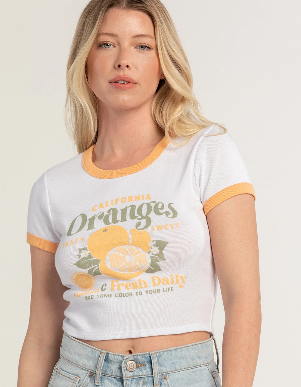 Full Tilt Oranges Ringer Tee. Large graphic screened on front. Rib knit. Contrasting color on neckline and sleeve hem. Ribbed crew neckline. Short sleeve. 50% Cotton, 50% Polyester. Machine wash. Imported.