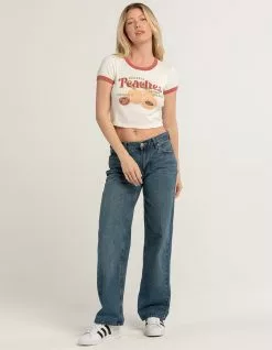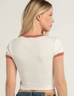 Full Tilt Peach Ringer Tee. Large graphic screened on front. Rib knit. Contrasting color on neckline and sleeve hem. Ribbed crew neckline. Short sleeve. 50% Cotton, 50% Polyester. Machine wash. Imported.