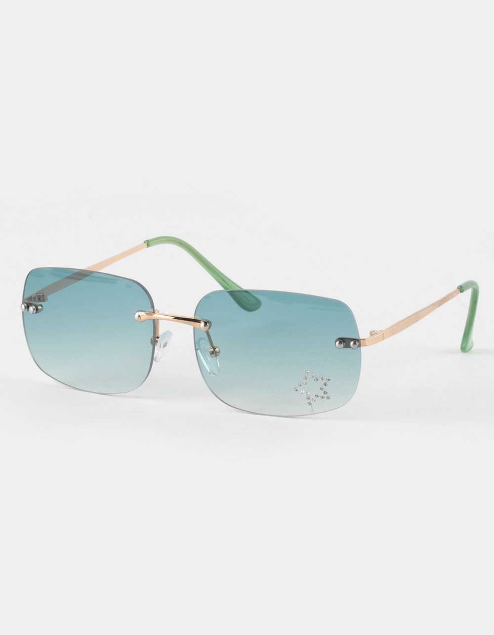 FULL TILT Rimless Rhinestone Heart Sunglasses. Colored tinted lenses. Silver toned arms and plastic tips. Rimless. Plastic nose guards. Rhinestone Heart detail. Imported