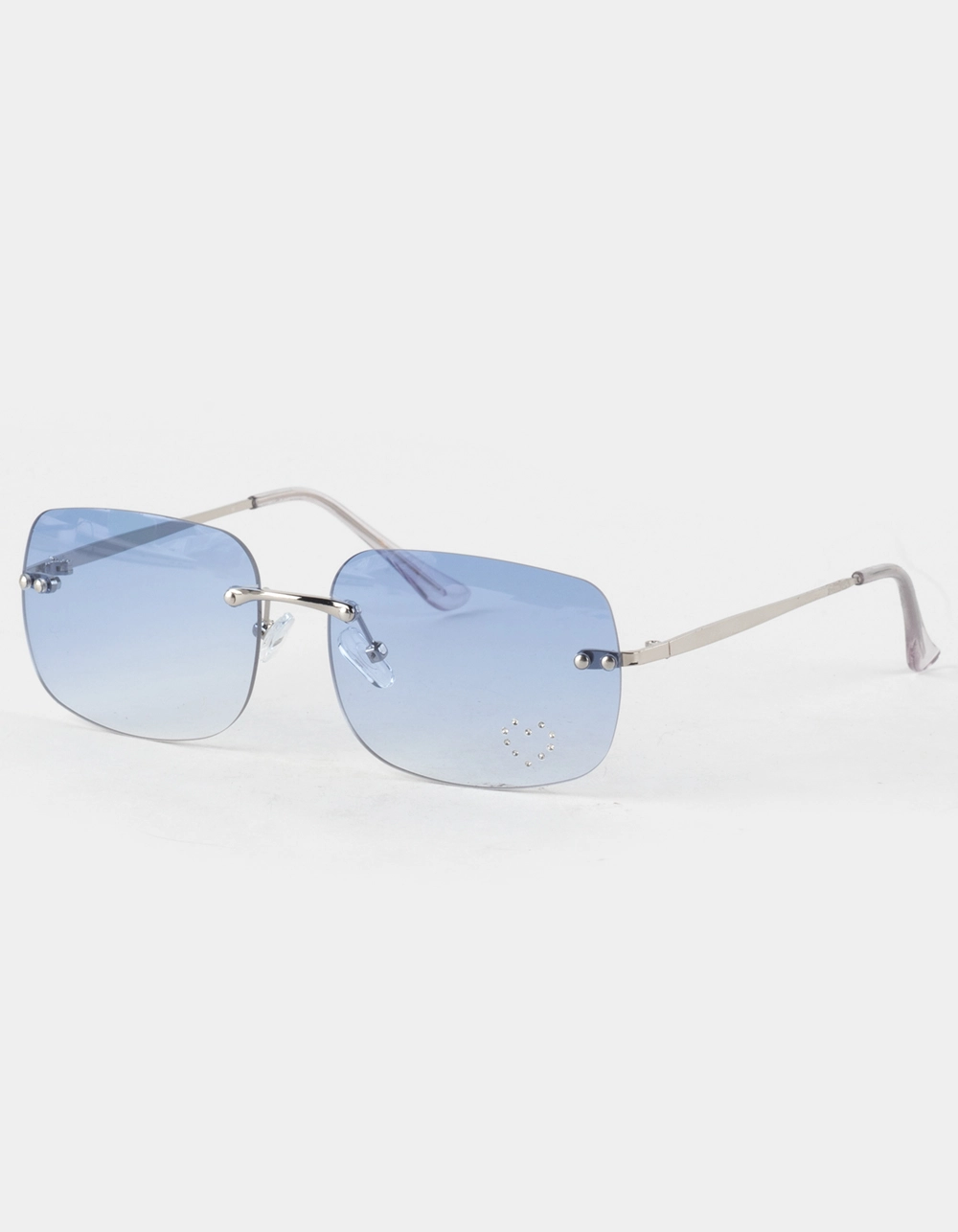 FULL TILT Rimless Rhinestone Star Sunglasses. Colored tinted lenses. Silver toned arms and plastic tips. Rimless. Plastic nose guards. Rhinestone Star detail. Imported.