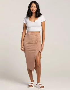 Full Tilt Ruched Side Slit Skirt. Allover texture. Elastic waist. Ruching panel with adjustable tie on front. Side leg slit. Ruffle trim. Approx. length: 30”. 95% Polyester, 5% Spandex. Hand wash. Imported.