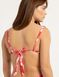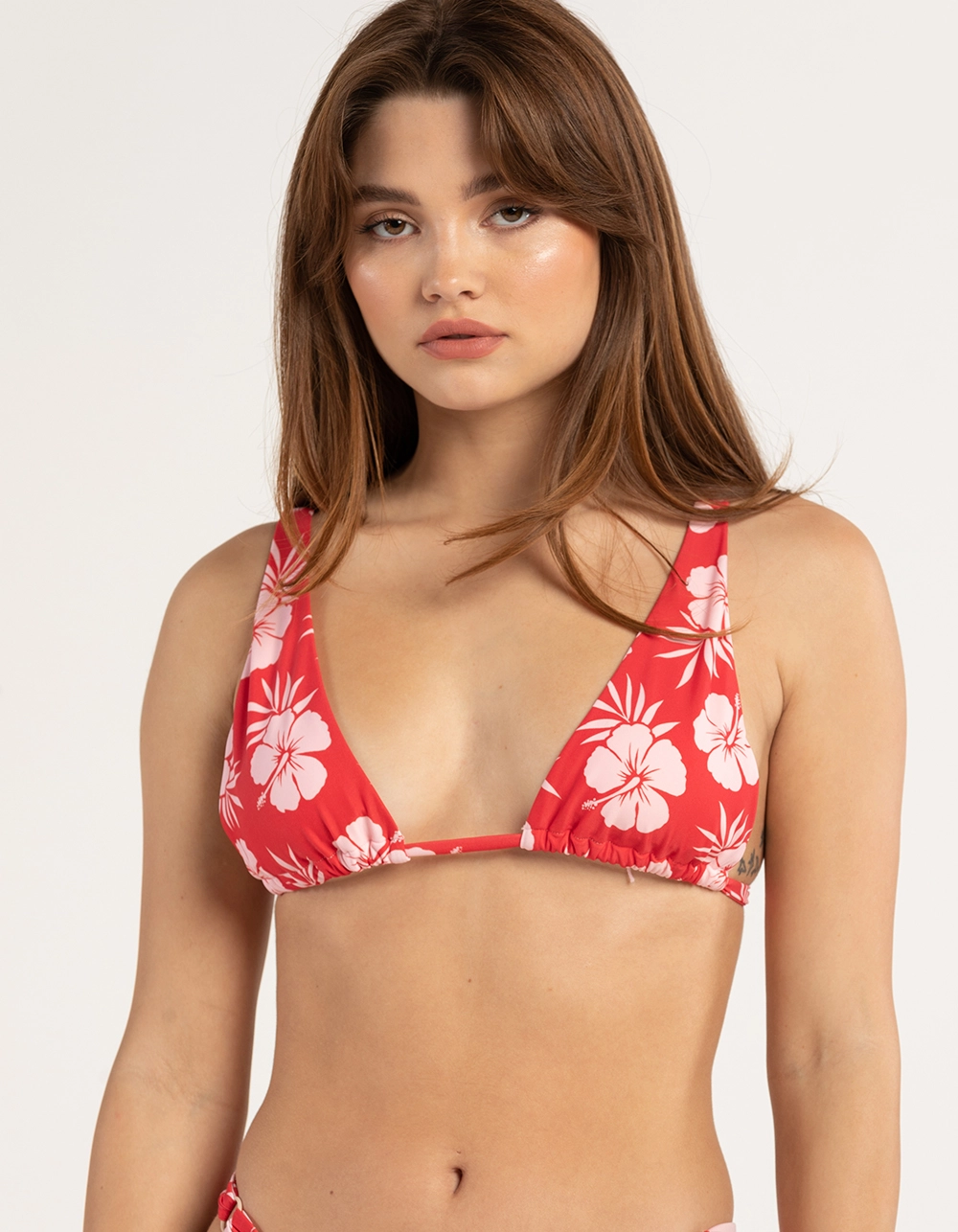 Full Tilt Tropical Tall Triangle Bikini Top. Allover tropical floral print. Adjustable shoulder straps and a back tie. Removeable bra pads. Slidable triangle cups for a custom fit. Outer fabric 82% Nylon, 18% Spandex. Lining 92% Recycled Polyester, 8% Spandex. Hand wash. Imported.