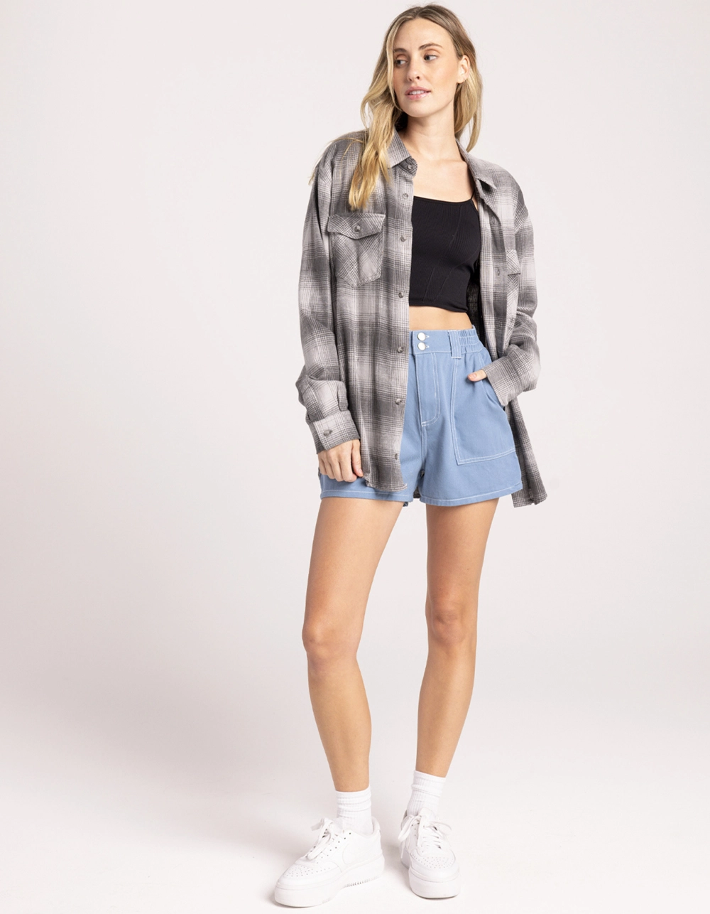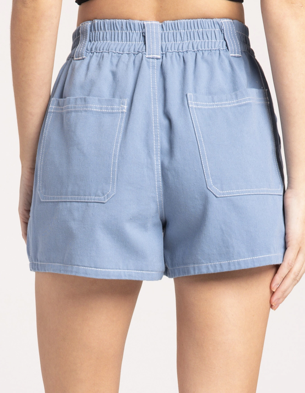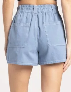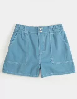 Full Tilt Utility Shorts. Double button front waist with elastic stretch & zipper fly. Slant hand pockets. Classic back pockets. Contrast seam stitching. Approx. inseam: 3″. 100% cotton. Machine wash. Imported