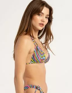 Full Tilt Wavy Double Triangle Bikini Top. Allover wavy and vibrant pattern. Double up string tie at the neck. Back tie. Removeable bra pads. Slidable triangle cups for a custom fit. Outer fabric: 82% Nylon, 18% Spandex. Lining: 92% recycled polyester, 8% Spandex. Hand wash. Imported.