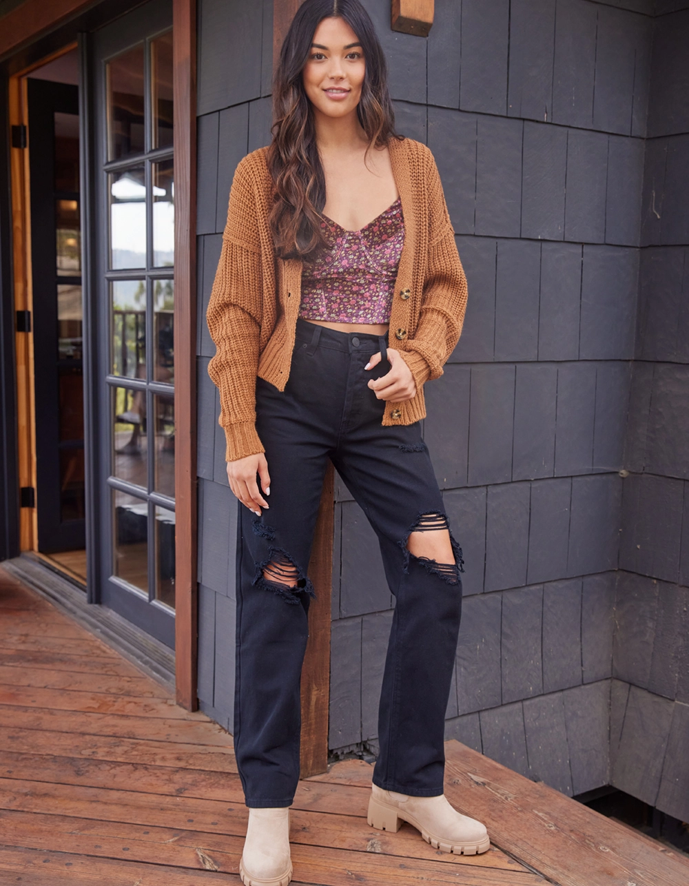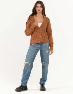 Full Tilt Cardigan V-Neck. Button front. Knitted cardigan. Ribbed cuffs and hem. Long sleeves. 88% Acrylic 6& Polyester 6% Nylon. Machine wash. Imported.