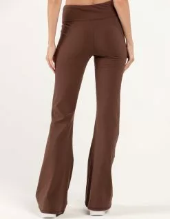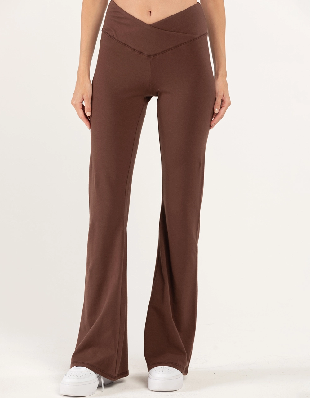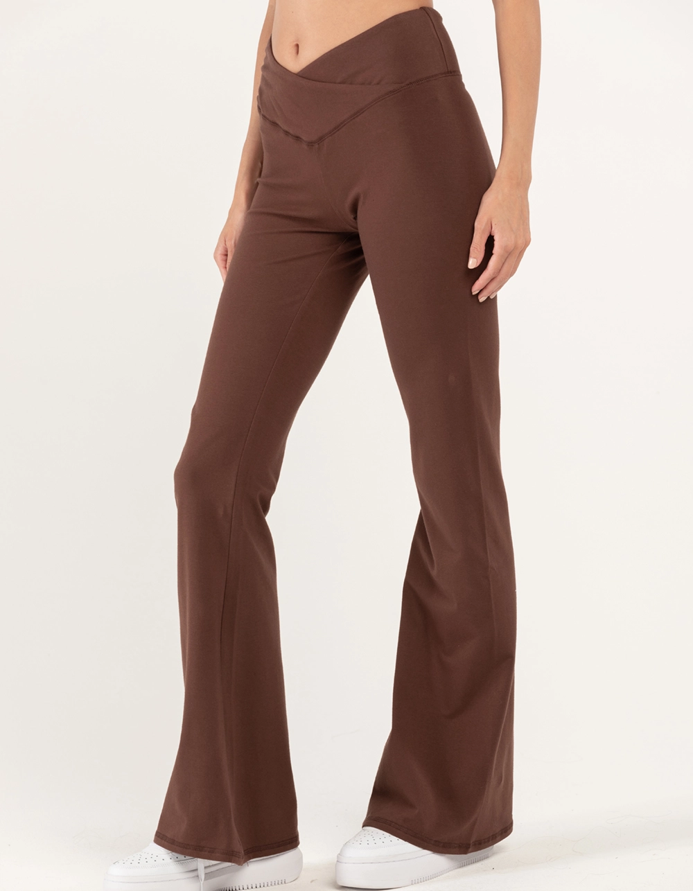 Full Tilt Crossover Waist Flare Leggings. Stretchy legging pants. Fitted through the knee. Flared leg openings. Crossover high-rise waist. Approx. inseam: 32.5″. 92% Cotton 8% Spandex. Hand wash. Imported.